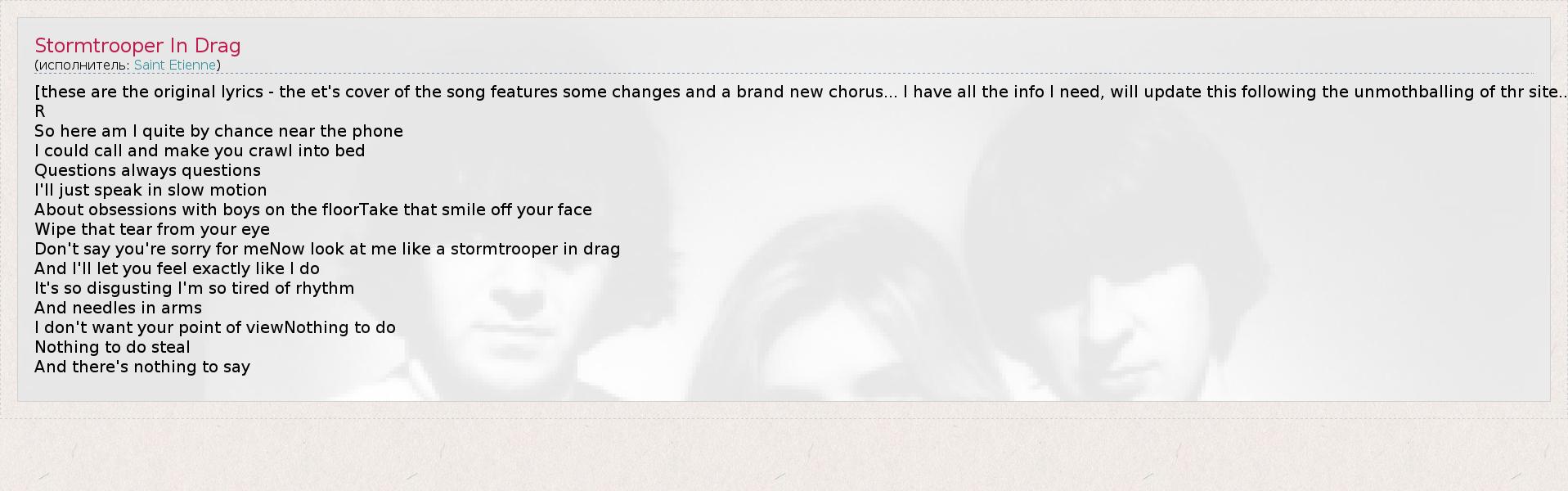 А как ты думаешь, о чем песня "Stormtrooper In Drag" ?
