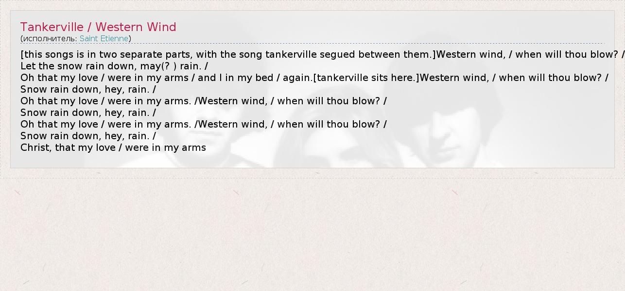 [this songs is in two separate parts, with the song tankerville segued between them.]Western wind, / when will thou blow? /