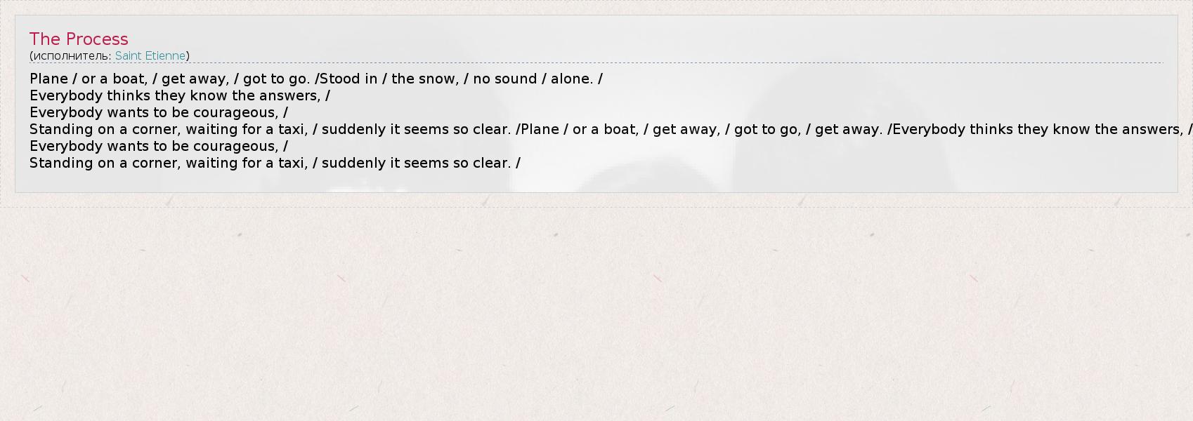 Plane / or a boat, / get away, / got to go. /Stood in / the snow, / no sound / alone. / Everybody thinks they know the answers, / Everybody wants to be courageous, / Standing on a corner, waiting for a taxi, / suddenly it seems so clear. /Plane / or a boat, / get away, / got to go, / get away. /Everybody thinks they know the answers, / Everybody wants to be courageous, / Standing on a corner, waiting for a taxi, / suddenly it seems so clear. /