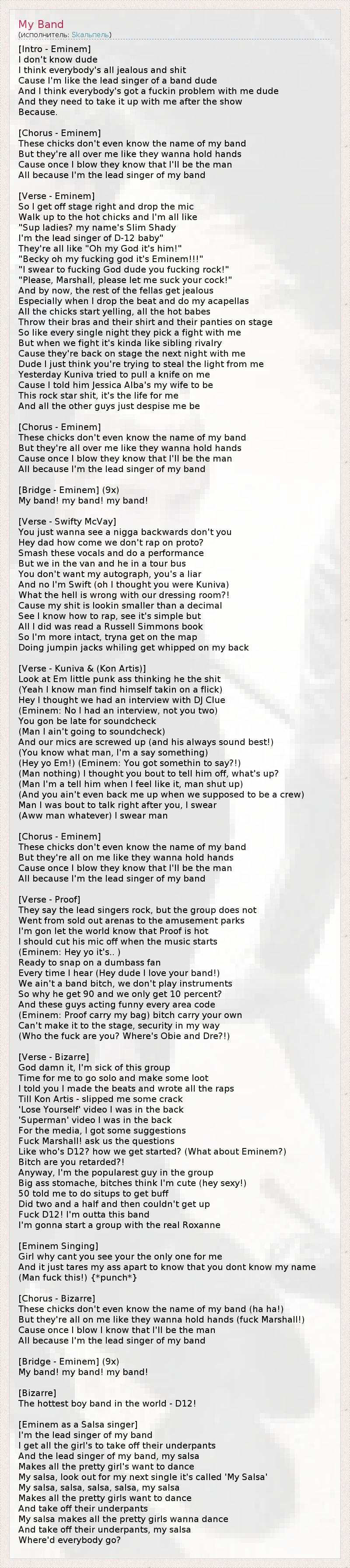 Это интересно:Год создания - 2001.12 октября 2001 г. Skaльпель впервые вышли на сцену московского клуба X-Ray.Примерное количество отыгранных концертов за период 10 лет - 450.Количество изданных альбомов - 3,количество изданных синглов - 2,количество изданных dvd - 1,количество опубликованных видео-клипов - 1.Лэйблы, на которых издавалась группа: BRP Records, 3-Tone Records, SoundAge Productions.Совместные выступления... продолжение