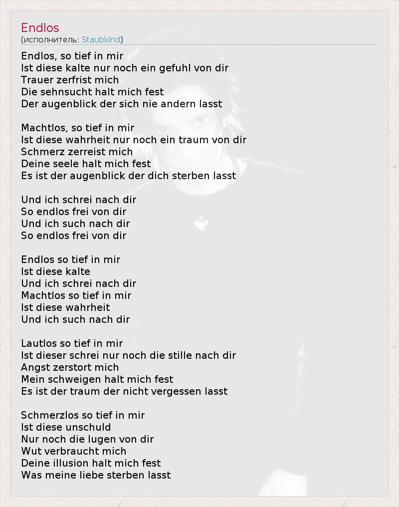 Это интересно:Творческий соло-проект Луиса Манке (Louis Manke) (гитариста из Terminal Choice), созданный в 2003 году. Выпустил четыре альбома: "Traumfänger" (2004), "Zu Weit" (2007), "Staubkind" (2012) и "Alles Was Ich Bin" (2014).Притягательная, с доминирующим гитарным звучанием музыка; эмоциональная, идущая из недр души лирика; "надломленный" чувственный вокал…