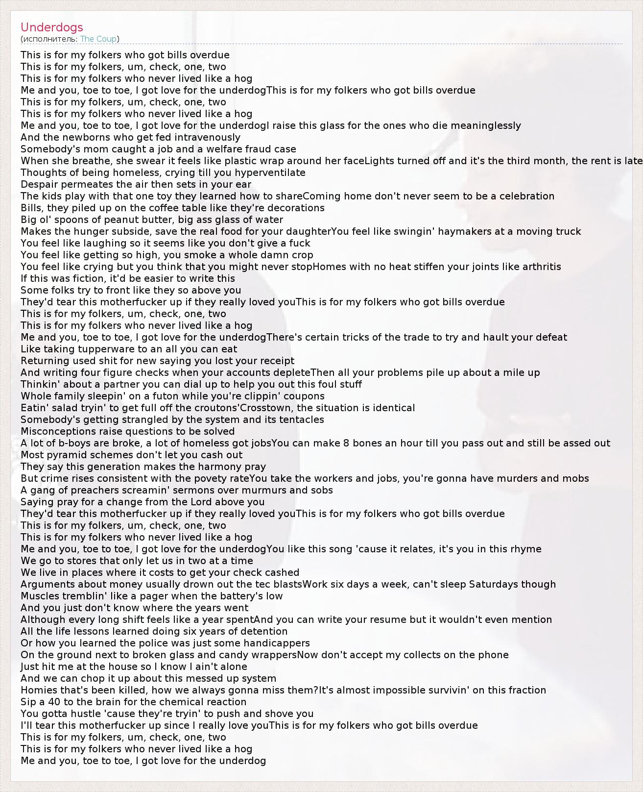 Me and you, toe to toe, I got love for the underdogThis is for my folkers who got bills overdue