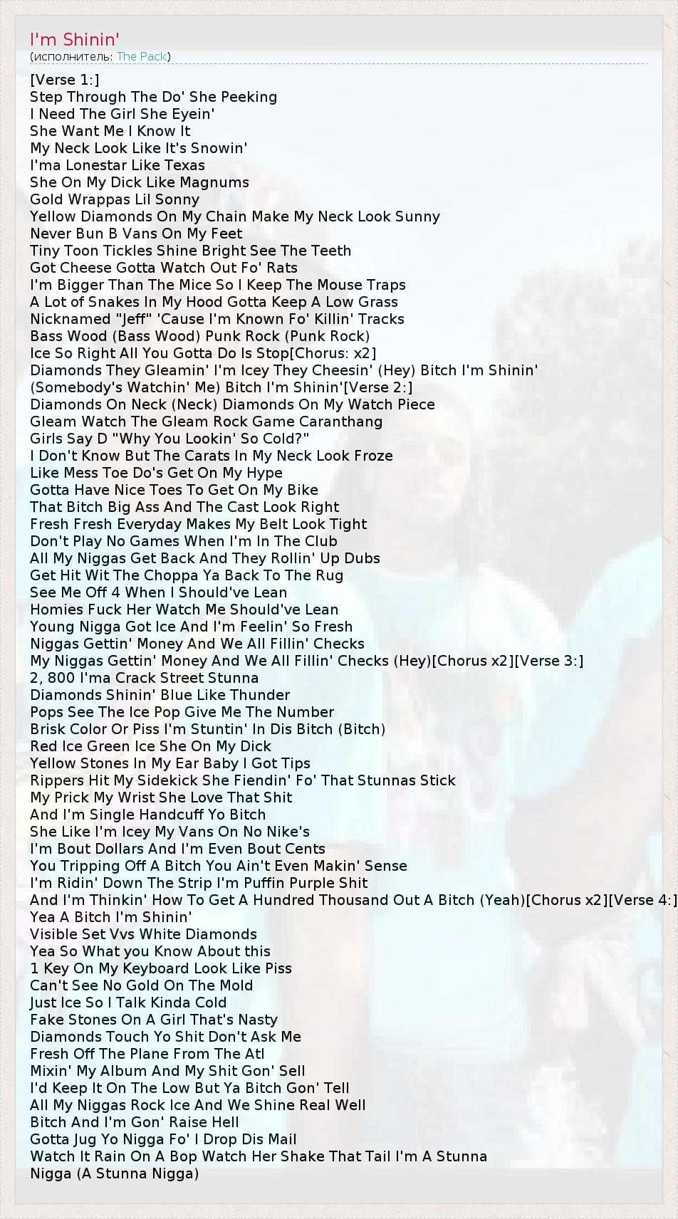[Verse 1:] Step Through The Do' She Peeking I Need The Girl She Eyein' She Want Me I Know It My Neck Look Like It's Snowin' I'ma Lonestar Like Texas She On My Dick Like Magnums Gold Wrappas Lil Sonny Yellow Diamonds On My Chain Make My Neck Look Sunny Never Bun B Vans On My Feet Tiny Toon Tickles Shine Bright See The Teeth Got Cheese Gotta Watch Out Fo' Rats I'm Bigger Than The Mice So I Keep The Mouse Traps A Lot of Snakes In My Hood Gotta Keep A Low Grass Nicknamed "Jeff" 'Cause I'm Known Fo' Killin' Tracks Bass Wood (Bass Wood) Punk Rock (Punk Rock) Ice So Right All You Gotta Do Is Stop[Chorus: x2] Diamonds They Gleamin' I'm Icey They Cheesin' (Hey) Bitch I'm Shinin' (Somebody's Watchin' Me) Bitch I'm Shinin'[Verse 2:] Diamonds On Neck (Neck) Diamonds On My Watch Piece Gleam Watch The Gleam Rock Game Caranthang Girls Say D "Why You Lookin' So Cold?" I Don't Know But The Carats In My Neck Look Froze Like Mess Toe Do's Get On My Hype Gotta Have Nice Toes To Get On My Bike That Bitch Big Ass And The Cast Look Right Fresh Fresh Everyday Makes My Belt Look Tight Don't Play No Games When I'm In The Club All My Niggas Get Back And They Rollin' Up Dubs Get Hit Wit The Choppa Ya Back To The Rug See Me Off 4 When I Should've Lean Homies Fuck Her Watch Me Should've Lean Young Nigga Got Ice And I'm Feelin' So Fresh Niggas Gettin' Money And We All Fillin' Checks My Niggas Gettin' Money And We All Fillin' Checks (Hey)[Chorus x2][Verse 3:] 2, 800 I'ma Crack Street Stunna Diamonds Shinin' Blue Like Thunder Pops See The Ice Pop Give Me The Number Brisk Color Or Piss I'm Stuntin' In Dis Bitch (Bitch) Red Ice Green Ice She On My Dick Yellow Stones In My Ear Baby I Got Tips Rippers Hit My Sidekick She Fiendin' Fo' That Stunnas Stick My Prick My Wrist She Love That Shit And I'm Single Handcuff Yo Bitch She Like I'm Icey My Vans On No Nike's I'm Bout Dollars And I'm Even Bout Cents You Tripping Off A Bitch You Ain't Even Makin' Sense I'm Ridin' Down The Strip I'm Puffin Purple Shit And I'm Thinkin' How To Get A Hundred Thousand Out A Bitch (Yeah)[Chorus x2][Verse 4:] Yea A Bitch I'm Shinin' Visible Set Vvs White Diamonds Yea So What you Know About this 1 Key On My Keyboard Look Like Piss Can't See No Gold On The Mold Just Ice So I Talk Kinda Cold Fake Stones On A Girl That's Nasty Diamonds Touch Yo Shit Don't Ask Me Fresh Off The Plane From The Atl Mixin' My Album And My Shit Gon' Sell I'd Keep It On The Low But Ya Bitch Gon' Tell All My Niggas Rock Ice And We Shine Real Well Bitch And I'm Gon' Raise Hell Gotta Jug Yo Nigga Fo' I Drop Dis Mail Watch It Rain On A Bop Watch Her Shake That Tail I'm A Stunna Nigga (A Stunna Nigga)