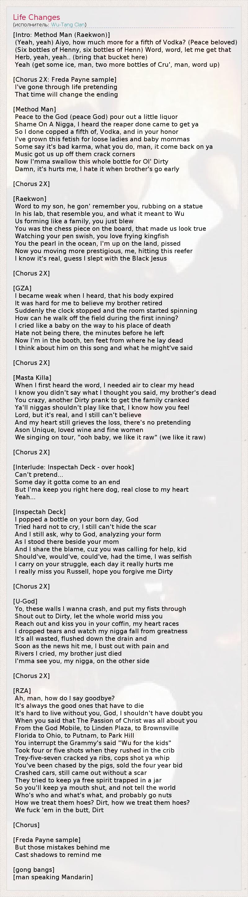 [Intro: Method Man (Raekwon)] (Yeah, yeah) Aiyo, how much more for a fifth of Vodka? (Peace beloved) (Six bottles of Henny, six bottles of Henn) Word, word, let me get that Herb, yeah, yeah.. (bring that bucket here) Yeah (get some ice, man, two more bottles of Cru', man, word up) [Chorus 2X: Freda Payne sample] I've gone through life pretending That time will change the ending [Method Man] Peace to the God (peace God) pour out a little liquor Shame On A Nigga, I heard the reaper done came to get ya So I done copped a fifth of, Vodka, and in your honor I've grown this fetish for loose ladies and baby mommas Some say it's bad karma, what you do, man, it come back on ya Music got us up off them crack corners Now I'mma swallow this whole bottle for Ol' Dirty Damn, it's hurts me, I hate it when brother's go early [Chorus 2X] [Raekwon] Word to my son, he gon' remember you, rubbing on a statue In his lab, that resemble you, and what it meant to Wu Us forming like a family, you just blew You was the chess piece on the board, that made us look true Watching your pen swish, you love frying kingfish You the pearl in the ocean, I'm up on the land, pissed Now you moving more prestigious, me, hitting this reefer I know it's real, guess I slept with the Black Jesus [Chorus 2X] [GZA] I became weak when I heard, that his body expired It was hard for me to believe my brother retired Suddenly the clock stopped and the room started spinning How can he walk off the field during the first inning? I cried like a baby on the way to his place of death Hate not being there, the minutes before he left Now I'm in the booth, ten feet from where he lay dead I think about him on this song and what he might've said [Chorus 2X] [Masta Killa] When I first heard the word, I needed air to clear my head I know you didn't say what I thought you said, my brother's dead You crazy, another Dirty prank to get the family cranked Ya'll niggas shouldn't play like that, I know how you feel Lord, but it's real, and I still can't believe And my heart still grieves the loss, there's no pretending Ason Unique, loved wine and fine women We singing on tour, "ooh baby, we like it raw" (we like it raw) [Chorus 2X] [Interlude: Inspectah Deck - over hook] Can't pretend... Some day it gotta come to an end But I'ma keep you right here dog, real close to my heart Yeah... [Inspectah Deck] I popped a bottle on your born day, God Tried hard not to cry, I still can't hide the scar And I still ask, why to God, analyzing your form As I stood there beside your mom And I share the blame, cuz you was calling for help, kid Should've, would've, could've, had the time, I was selfish I carry on your struggle, each day it really hurts me I really miss you Russell, hope you forgive me Dirty [Chorus 2X] [U-God] Yo, these walls I wanna crash, and put my fists through Shout out to Dirty, let the whole world miss you Reach out and kiss you in your coffin, my heart races I dropped tears and watch my nigga fall from greatness It's all wasted, flushed down the drain and Soon as the news hit me, I bust out with pain and Rivers I cried, my brother just died I'mma see you, my nigga, on the other side [Chorus 2X] [RZA] Ah, man, how do I say goodbye? It's always the good ones that have to die It's hard to live without you, God, I shouldn't have doubt you When you said that The Passion of Christ was all about you From the God Mobile, to Linden Plaza, to Brownsville Florida to Ohio, to Putnam, to Park Hill You interrupt the Grammy's said "Wu for the kids" Took four or five shots when they rushed in the crib Trey-five-seven cracked ya ribs, cops shot ya whip You've been chased by the pigs, sold the four year bid Crashed cars, still came out without a scar They tried to keep ya free spirit trapped in a jar So you'll keep ya mouth shut, and not tell the world Who's who and what's what, and probably go nuts How we treat them hoes? Dirt, how we treat them hoes? We fuck 'em in the butt, Dirt [Chorus] [Freda Payne sample] But those mistakes behind me Cast shadows to remind me [gong bangs] [man speaking Mandarin]