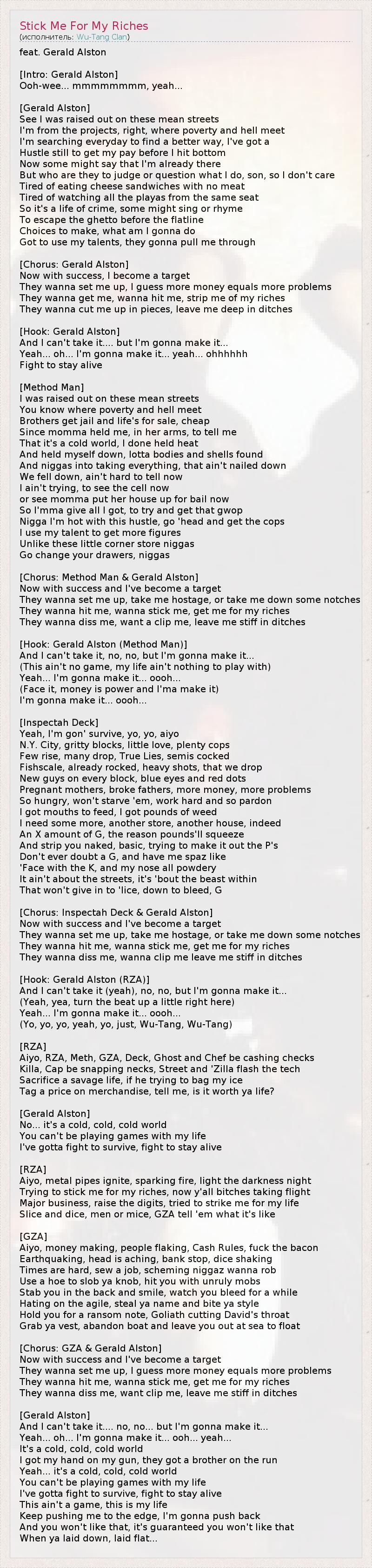 А как ты думаешь, о чем песня "Stick Me For My Riches" ?