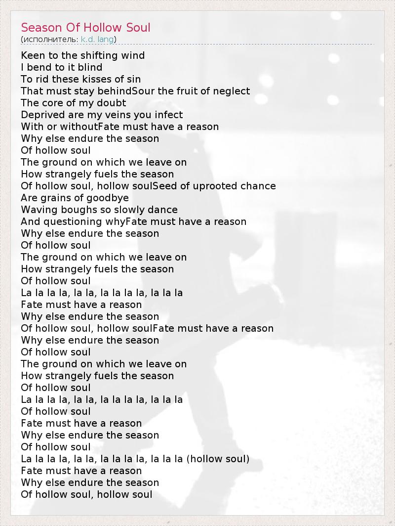 Keen to the shifting wind I bend to it blind To rid these kisses of sin That must stay behindSour the fruit of neglect The core of my doubt Deprived are my veins you infect With or withoutFate must have a reason Why else endure the season Of hollow soul The ground on which we leave on How strangely fuels the season Of hollow soul, hollow soulSeed of uprooted chance Are grains of goodbye Waving boughs so slowly dance And questioning whyFate must have a reason Why else endure the season Of hollow soul The ground on which we leave on How strangely fuels the season Of hollow soul La la la la, la la, la la la la, la la la Fate must have a reason Why else endure the season Of hollow soul, hollow soulFate must have a reason Why else endure the season Of hollow soul The ground on which we leave on How strangely fuels the season Of hollow soul La la la la, la la, la la la la, la la la Of hollow soul Fate must have a reason Why else endure the season Of hollow soul La la la la, la la, la la la la, la la la (hollow soul) Fate must have a reason Why else endure the season Of hollow soul, hollow soul