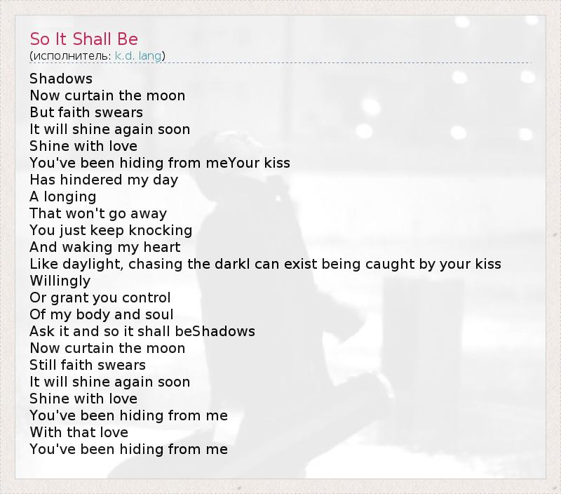 Shadows Now curtain the moon But faith swears It will shine again soon Shine with love You've been hiding from meYour kiss Has hindered my day A longing That won't go away You just keep knocking And waking my heart Like daylight, chasing the darkI can exist being caught by your kiss Willingly Or grant you control Of my body and soul Ask it and so it shall beShadows Now curtain the moon Still faith swears It will shine again soon Shine with love You've been hiding from me With that love You've been hiding from me