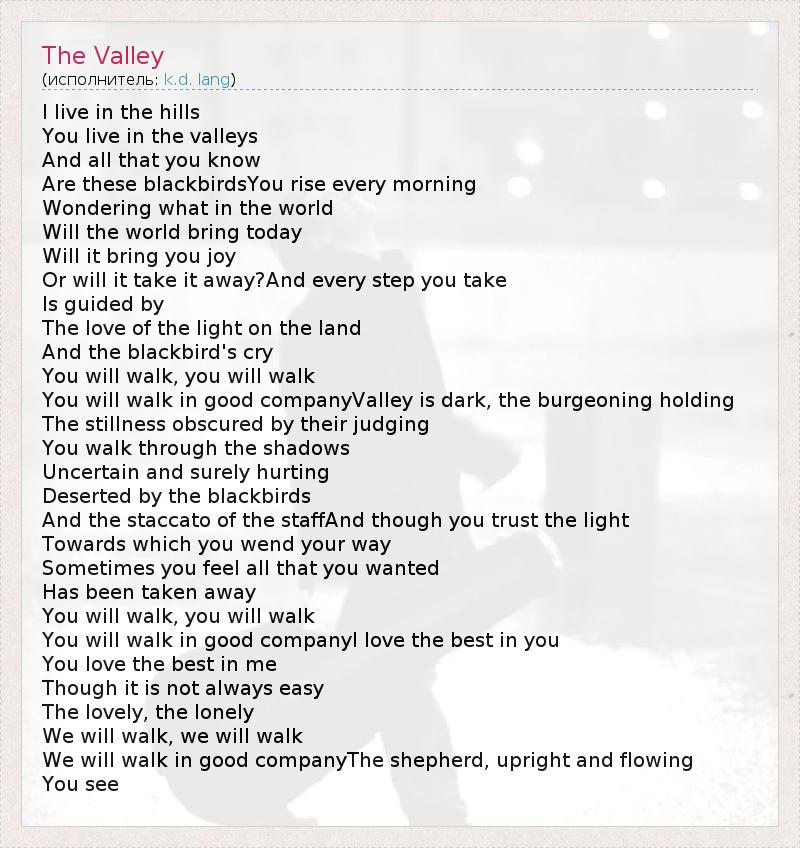 I live in the hills You live in the valleys And all that you know Are these blackbirdsYou rise every morning Wondering what in the world Will the world bring today Will it bring you joy Or will it take it away?And every step you take Is guided by The love of the light on the land And the blackbird's cry You will walk, you will walk You will walk in good companyValley is dark, the burgeoning holding The stillness obscured by their judging You walk through the shadows Uncertain and surely hurting Deserted by the blackbirds And the staccato of the staffAnd though you trust the light Towards which you wend your way Sometimes you feel all that you wanted Has been taken away You will walk, you will walk You will walk in good companyI love the best in you You love the best in me Though it is not always easy The lovely, the lonely We will walk, we will walk We will walk in good companyThe shepherd, upright and flowing You see