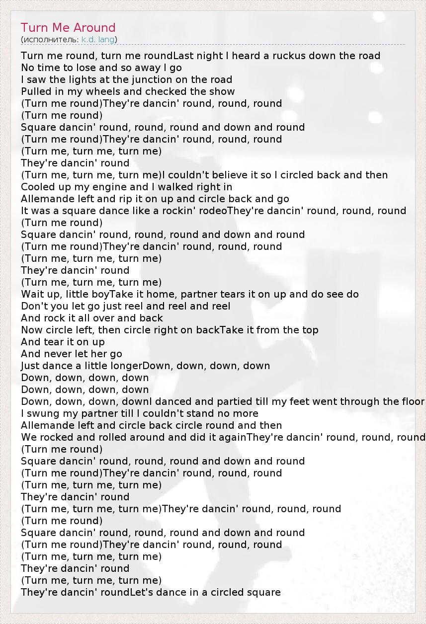Turn me round, turn me roundLast night I heard a ruckus down the road No time to lose and so away I go I saw the lights at the junction on the road Pulled in my wheels and checked the show (Turn me round)They're dancin' round, round, round (Turn me round) Square dancin' round, round, round and down and round (Turn me round)They're dancin' round, round, round (Turn me, turn me, turn me) They're dancin' round (Turn me, turn me, turn me)I couldn't believe it so I circled back and then Cooled up my engine and I walked right in Allemande left and rip it on up and circle back and go It was a square dance like a rockin' rodeoThey're dancin' round, round, round (Turn me round) Square dancin' round, round, round and down and round (Turn me round)They're dancin' round, round, round (Turn me, turn me, turn me) They're dancin' round (Turn me, turn me, turn me) Wait up, little boyTake it home, partner tears it on up and do see do Don't you let go just reel and reel and reel And rock it all over and back Now circle left, then circle right on backTake it from the top And tear it on up And never let her go Just dance a little longerDown, down, down, down Down, down, down, down Down, down, down, down Down, down, down, downI danced and partied till my feet went through the floor I swung my partner till I couldn't stand no more Allemande left and circle back circle round and then We rocked and rolled around and did it againThey're dancin' round, round, round (Turn me round) Square dancin' round, round, round and down and round (Turn me round)They're dancin' round, round, round (Turn me, turn me, turn me) They're dancin' round (Turn me, turn me, turn me)They're dancin' round, round, round (Turn me round) Square dancin' round, round, round and down and round (Turn me round)They're dancin' round, round, round (Turn me, turn me, turn me) They're dancin' round (Turn me, turn me, turn me) They're dancin' roundLet's dance in a circled square