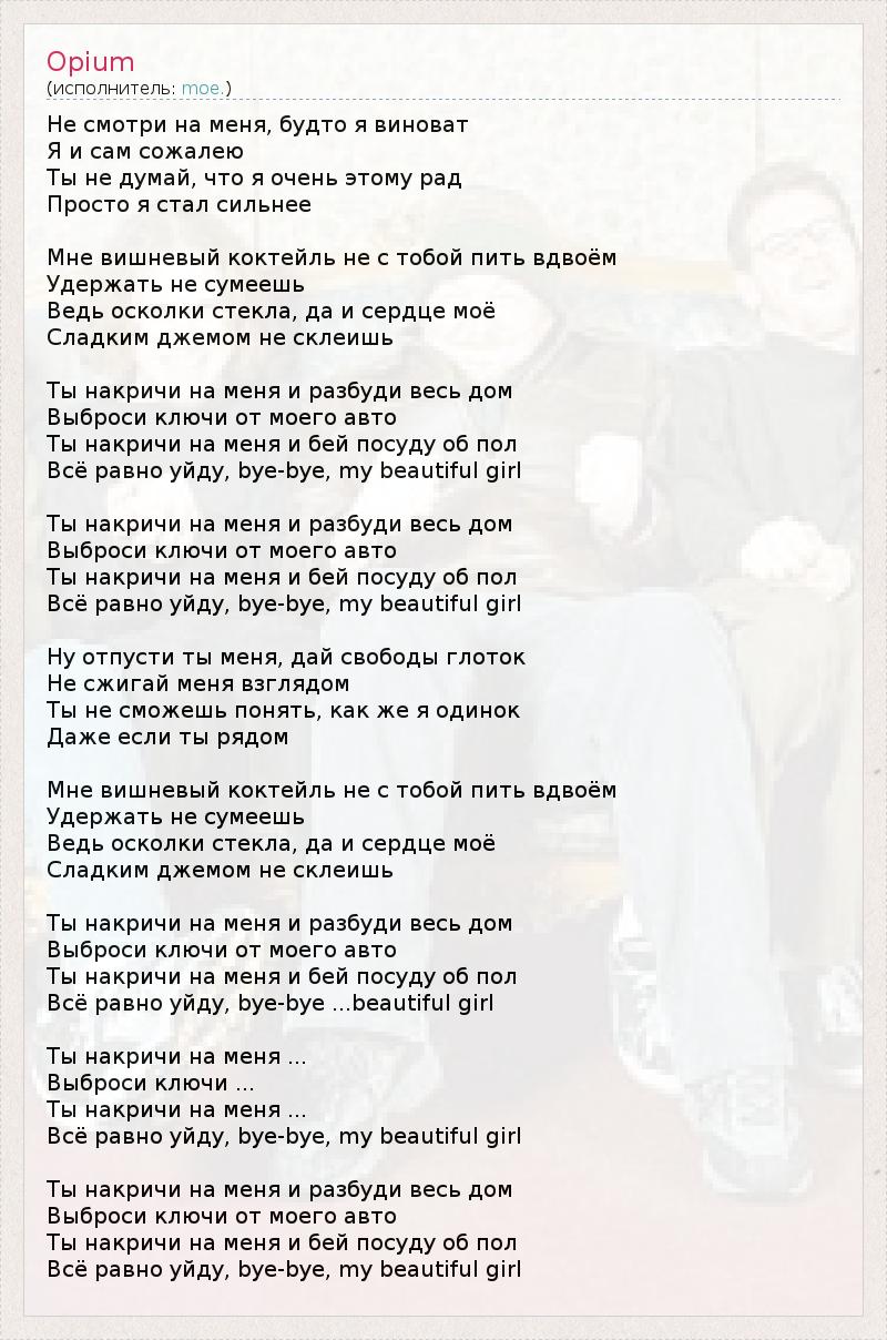 Не смотри на меня, будто я виноват Я и сам сожалею Ты не думай, что я очень этому рад Просто я стал сильнее Мне вишневый коктейль не с тобой пить вдвоём Удержать не сумеешь Ведь осколки стекла, да и сердце моё Сладким джемом не склеишь Ты накричи на меня и разбуди весь дом Выброси ключи от моего авто Ты накричи на меня и бей посуду об пол Всё равно уйду, bye-bye, my beautiful girl Ты накричи на меня и разбуди весь дом Выброси ключи от моего авто Ты накричи на меня и бей посуду об пол Всё равно уйду, bye-bye, my beautiful girl Ну отпусти ты меня, дай свободы глоток Не сжигай меня взглядом Ты не сможешь понять, как же я одинок Даже если ты рядом Мне вишневый коктейль не с тобой пить вдвоём Удержать не сумеешь Ведь осколки стекла, да и сердце моё Сладким джемом не склеишь Ты накричи на меня и разбуди весь дом Выброси ключи от моего авто Ты накричи на меня и бей посуду об пол Всё равно уйду, bye-bye ...beautiful girl Ты накричи на меня ... Выброси ключи ... Ты накричи на меня ... Всё равно уйду, bye-bye, my beautiful girl Ты накричи на меня и разбуди весь дом Выброси ключи от моего авто Ты накричи на меня и бей посуду об пол Всё равно уйду, bye-bye, my beautiful girl