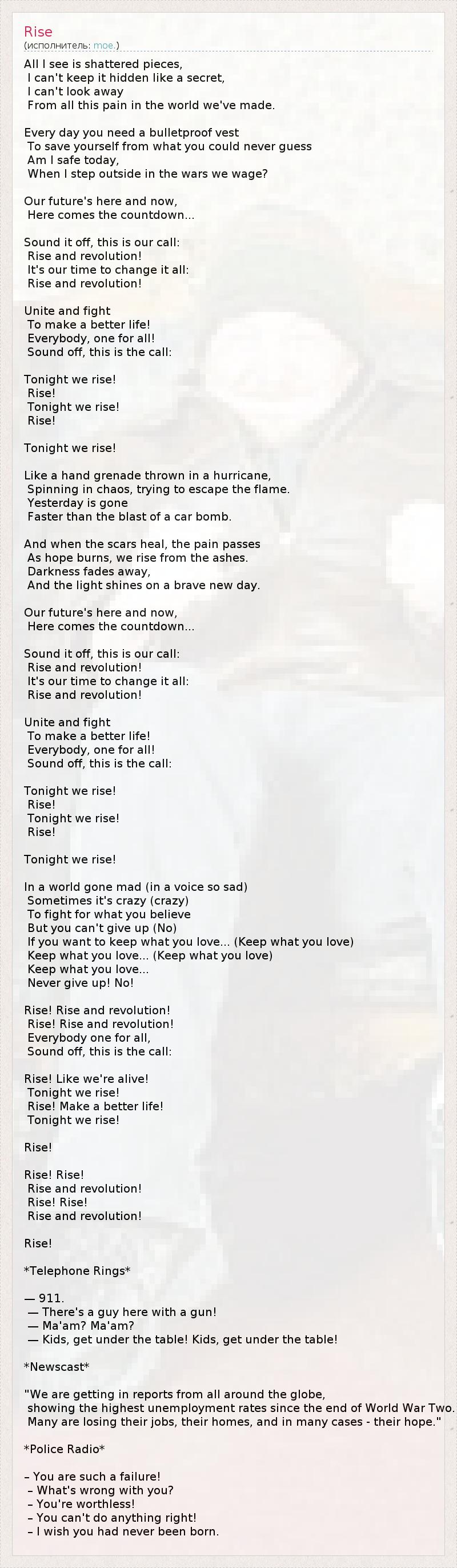Всё, что я вижу — осколки. Я не могу больше хранить тайну, Я не могу отвернуться От всей боли, что мы причиняем в мире. Каждый день тебе нужен бронежилет, Чтобы спастись от очередной неожиданности. "В безопасности ли я сегодня, Выходя на улицу, в войны, что мы ведём?" Наше будущее здесь и сейчас, Идёт обратный отсчёт... Выскажи всё, вот наш призыв: Восстание и революция! Настал наш час всё изменить: Восстание и революция! Объединитесь и сражайтесь За лучшую жизнь! Все как один, Выскажите всё, вот наш призыв: Сегодня мы восстаём! Восстань! Сегодня мы восстаём! Восстань! Сегодня мы восстаём! Как ручная граната, брошенная в ураган, Кручусь в хаосе, стараясь избежать пламени. "Вчера" прошло быстрее, Чем взрыв автомобильной бомбы. Когда же шрамы заживают, боль уходит, Надежда возгорается, мы восстаём из пепла, Тьма ослабевает, И свет сияет дивным новым днём. Наше будущее здесь и сейчас, Идёт обратный отсчёт... Выскажи всё, вот наш призыв: Восстание и революция! Настал наш час всё изменить: Восстание и революция! Объединись, сражайся! За лучшую жизнь! Все как один, Выскажите всё, вот наш призыв: Сегодня мы восстаём! Восстань! Сегодня мы восстаём! Восстань! Сегодня, мы восстаём! В съехавшем с катушек мире (с грустью в голосе) Иногда кажется безумным (безумным!) — Сражаться за то, во что веришь, Но ты не можешь сдаться (Нет!), Если хочешь сохранить то, что любишь... (сохранить то, что любишь), Сохранить то, что любишь... (сохранить то, что любишь), Сохранить то, что любишь... Никогда не сдавайся! Нет! Восстань! Восстание и революция! Восстань! Восстание и революция! Все как один, Выскажите всё, вот наш призыв: Восстань! Мы оживаем! Сегодня мы восстаём! Восстань! Сделай жизнь лучше! Сегодня мы восстаём! Восстань! Восстань, восстань! Восстание и революция! Восстань, восстань! Восстание и революция! Восстань! *Звонит телефон* — 911. — Тут парень с пистолетом! — Мэм? Мэм? — Дети, прячьтесь под стол! Дети, лезьте под стол! *Выпуск новостей* "Мы получаем сообщения со всего земного шара, свидетельствующие о высочайшем уровне безработицы с момента окончания Второй Мировой войны. Многие теряют работу, дома, и во многих случаях — надежду." *Полицейская рация* — Ты такой неудачник! — Что с тобой происходит? — Ты бесполезен! — Ты не можешь ничего сделать правильно! — Лучше бы ты не появлялся на свет!