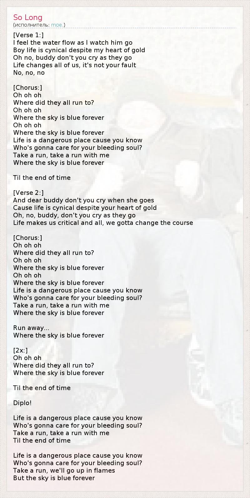 [Verse 1:] I feel the water flow as I watch him go Boy life is cynical despite my heart of gold Oh no, buddy don't you cry as they go Life changes all of us, it's not your fault No, no, no [Chorus:] Oh oh oh Where did they all run to? Oh oh oh Where the sky is blue forever Oh oh oh Where the sky is blue forever Life is a dangerous place cause you know Who's gonna care for your bleeding soul? Take a run, take a run with me Where the sky is blue forever Til the end of time [Verse 2:] And dear buddy don't you cry when she goes Cause life is cynical despite your heart of gold Oh, no, buddy, don't you cry as they go Life makes us critical and all, we gotta change the course [Chorus:] Oh oh oh Where did they all run to? Oh oh oh Where the sky is blue forever Oh oh oh Where the sky is blue forever Life is a dangerous place cause you know Who's gonna care for your bleeding soul? Take a run, take a run with me Where the sky is blue forever Run away... Where the sky is blue forever [2x:] Oh oh oh Where did they all run to? Where the sky is blue forever Til the end of time Diplo! Life is a dangerous place cause you know Who's gonna care for your bleeding soul? Take a run, take a run with me Til the end of time Life is a dangerous place cause you know Who's gonna care for your bleeding soul? Take a run, we'll go up in flames But the sky is blue forever