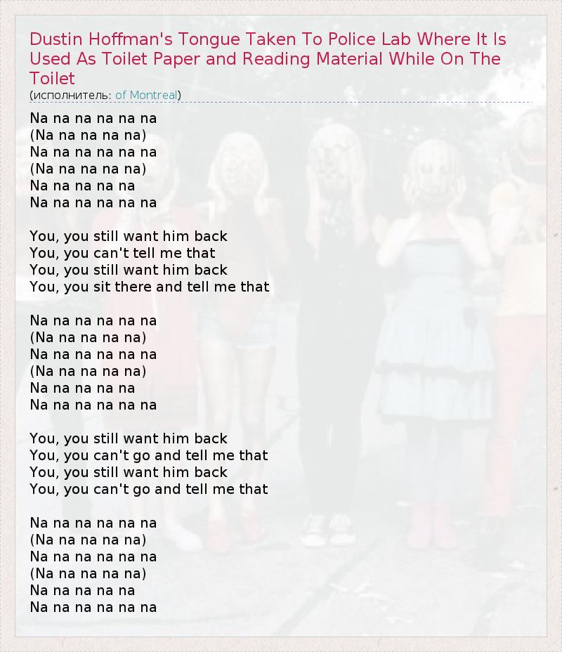 А как ты думаешь, о чем песня "Dustin Hoffman's Tongue Taken To Police Lab Where It Is Used As Toilet Paper and Reading Material While On The Toilet" ?