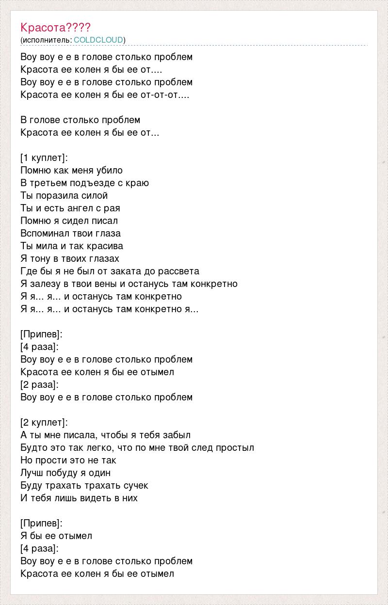 Воу воу е е в голове столько проблем Красота ее колен я бы ее от.... Воу воу е е в голове столько проблем Красота ее колен я бы ее от-от-от.... В голове столько проблем Красота ее колен я бы ее от... [1 куплет]: Помню как меня убило В третьем подъезде с краю Ты поразила силой Ты и есть ангел с рая Помню я сидел писал Вспоминал твои глаза Ты мила и так красива Я тону в твоих глазах Где бы я не был от заката до рассвета Я залезу в твои вены и останусь там конкретно Я я... я... и останусь там конкретно Я я... я... и останусь там конкретно я... [Припев]: [4 раза]: Воу воу е е в голове столько проблем Красота ее колен я бы ее отымел [2 раза]: Воу воу е е в голове столько проблем [2 куплет]: А ты мне писала, чтобы я тебя забыл Будто это так легко, что по мне твой след простыл Но прости это не так Лучш побуду я один Буду трахать трахать сучек И тебя лишь видеть в них [Припев]: Я бы ее отымел [4 раза]: Воу воу е е в голове столько проблем Красота ее колен я бы ее отымел