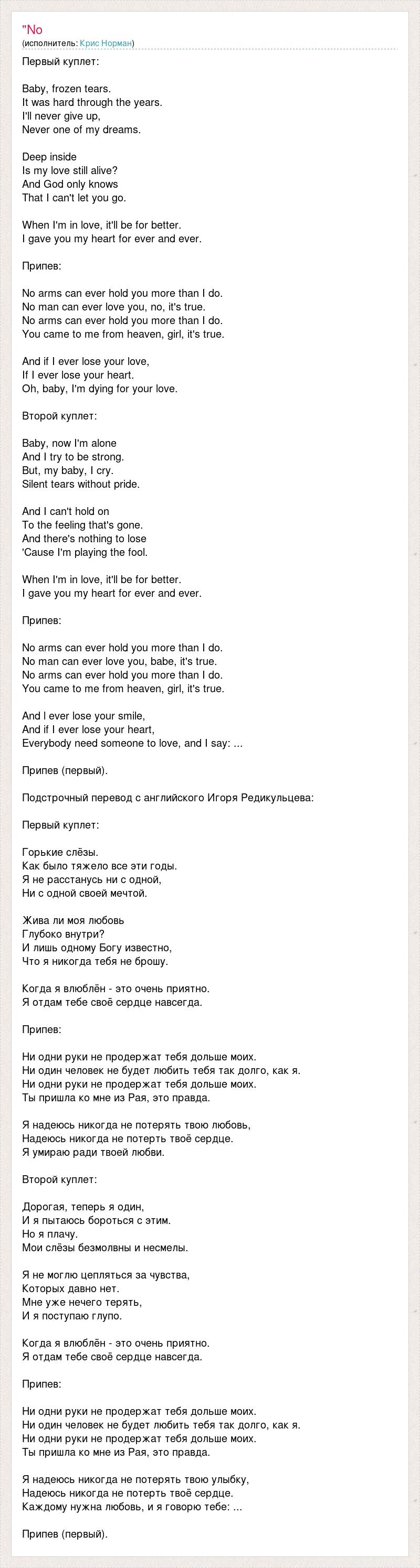 Первый куплет: Baby, frozen tears. It was hard through the years. I'll never give up, Never one of my dreams. Deep inside Is my love still alive? And God only knows That I can't let you go. When I'm in love, it'll be for better. I gave you my heart for ever and ever. Припев: No arms can ever hold you more than I do. No man can ever love you, no, it's true. No arms can ever hold you more than I do. You came to me from heaven, girl, it's true. And if I ever lose your love, If I ever lose your heart. Oh, baby, I'm dying for your love. Второй куплет: Baby, now I'm alone And I try to be strong. But, my baby, I cry. Silent tears without pride. And I can't hold on To the feeling that's gone. And there's nothing to lose 'Cause I'm playing the fool. When I'm in love, it'll be for better. I gave you my heart for ever and ever. Припев: No arms can ever hold you more than I do. No man can ever love you, babe, it's true. No arms can ever hold you more than I do. You came to me from heaven, girl, it's true. And l ever lose your smile, And if I ever lose your heart, Everybody need someone to love, and I say: ... Припев (первый). Подстрочный перевод с английского Игоря Редикульцева: Первый куплет: Горькие слёзы. Как было тяжело все эти годы. Я не расстанусь ни с одной, Ни с одной своей мечтой. Жива ли моя любовь Глубоко внутри? И лишь одному Богу известно, Что я никогда тебя не брошу. Когда я влюблён - это очень приятно. Я отдам тебе своё сердце навсегда. Припев: Ни одни руки не продержат тебя дольше моих. Ни один человек не будет любить тебя так долго, как я. Ни одни руки не продержат тебя дольше моих. Ты пришла ко мне из Рая, это правда. Я надеюсь никогда не потерять твою любовь, Надеюсь никогда не потерть твоё сердце. Я умираю ради твоей любви. Второй куплет: Дорогая, теперь я один, И я пытаюсь бороться с этим. Но я плачу. Мои слёзы безмолвны и несмелы. Я не моглю цепляться за чувства, Которых давно нет. Мне уже нечего терять, И я поступаю глупо. Когда я влюблён - это очень приятно. Я отдам тебе своё сердце навсегда. Припев: Ни одни руки не продержат тебя дольше моих. Ни один человек не будет любить тебя так долго, как я. Ни одни руки не продержат тебя дольше моих. Ты пришла ко мне из Рая, это правда. Я надеюсь никогда не потерять твою улыбку, Надеюсь никогда не потерть твоё сердце. Каждому нужна любовь, и я говорю тебе: ... Припев (первый).