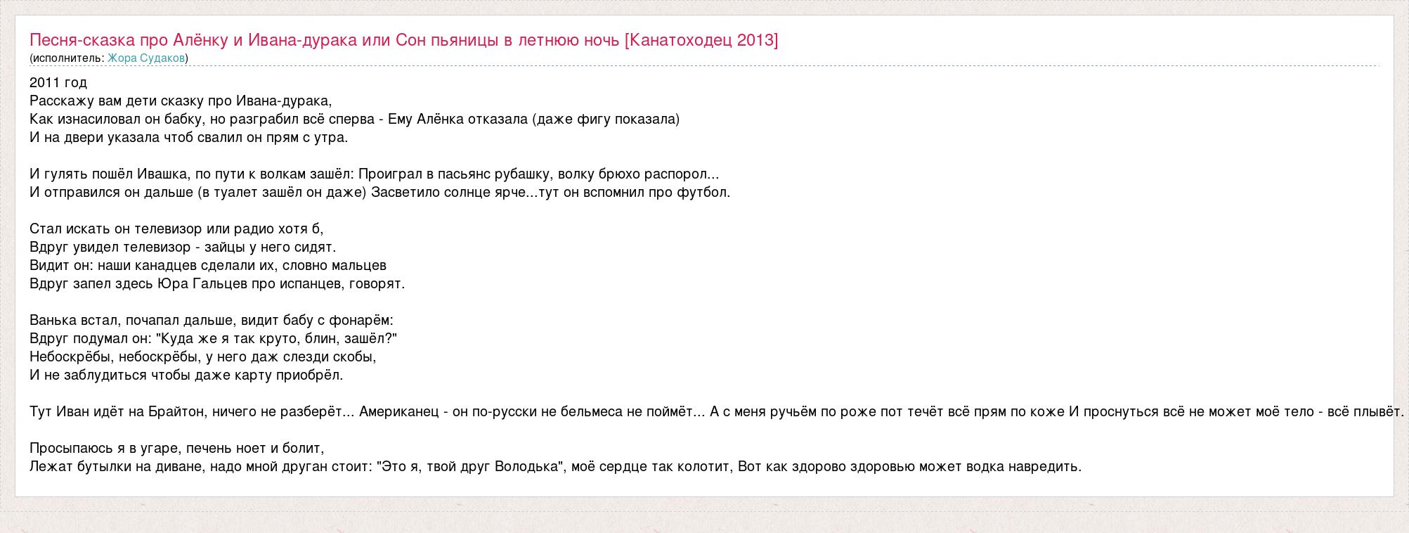 Главная→Исполнители→Жора Судаков→Песня-сказка про Алёнку и Ивана-дурака или Сон пьяницы в летнюю ночь [