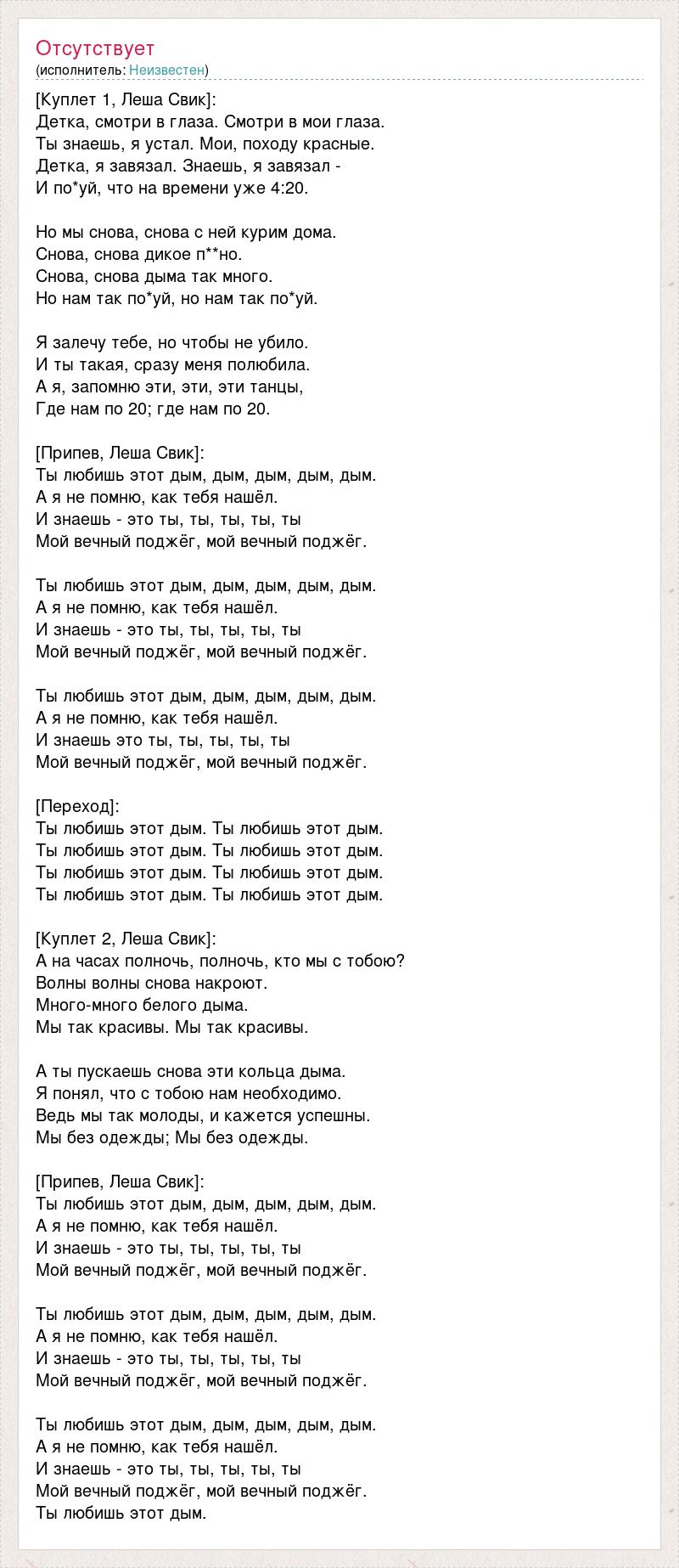 [Куплет 1, Леша Свик]: Детка, смотри в глаза. Смотри в мои глаза. Ты знаешь, я устал. Мои, походу красные. Детка, я завязал. Знаешь, я завязал - И по*уй, что на времени уже 4:20. Но мы снова, снова с ней курим дома. Снова, снова дикое п**но. Снова, снова дыма так много. Но нам так по*уй, но нам так по*уй. Я залечу тебе, но чтобы не убило. И ты такая, сразу меня полюбила. А я, запомню эти, эти, эти танцы, Где нам по 20; где нам по 20. [Припев, Леша Свик]: Ты любишь этот дым, дым, дым, дым, дым. А я не помню, как тебя нашёл. И знаешь - это ты, ты, ты, ты, ты Мой вечный поджёг, мой вечный поджёг. Ты любишь этот дым, дым, дым, дым, дым. А я не помню, как тебя нашёл. И знаешь - это ты, ты, ты, ты, ты Мой вечный поджёг, мой вечный поджёг. Ты любишь этот дым, дым, дым, дым, дым. А я не помню, как тебя нашёл. И знаешь это ты, ты, ты, ты, ты Мой вечный поджёг, мой вечный поджёг. [Переход]: Ты любишь этот дым. Ты любишь этот дым. Ты любишь этот дым. Ты любишь этот дым. Ты любишь этот дым. Ты любишь этот дым. Ты любишь этот дым. Ты любишь этот дым. [Куплет 2, Леша Свик]: А на часах полночь, полночь, кто мы с тобою? Волны волны снова накроют. Много-много белого дыма. Мы так красивы. Мы так красивы. А ты пускаешь снова эти кольца дыма. Я понял, что с тобою нам необходимо. Ведь мы так молоды, и кажется успешны. Мы без одежды; Мы без одежды. [Припев, Леша Свик]: Ты любишь этот дым, дым, дым, дым, дым. А я не помню, как тебя нашёл. И знаешь - это ты, ты, ты, ты, ты Мой вечный поджёг, мой вечный поджёг. Ты любишь этот дым, дым, дым, дым, дым. А я не помню, как тебя нашёл. И знаешь - это ты, ты, ты, ты, ты Мой вечный поджёг, мой вечный поджёг. Ты любишь этот дым, дым, дым, дым, дым. А я не помню, как тебя нашёл. И знаешь - это ты, ты, ты, ты, ты Мой вечный поджёг, мой вечный поджёг. Ты любишь этот дым.