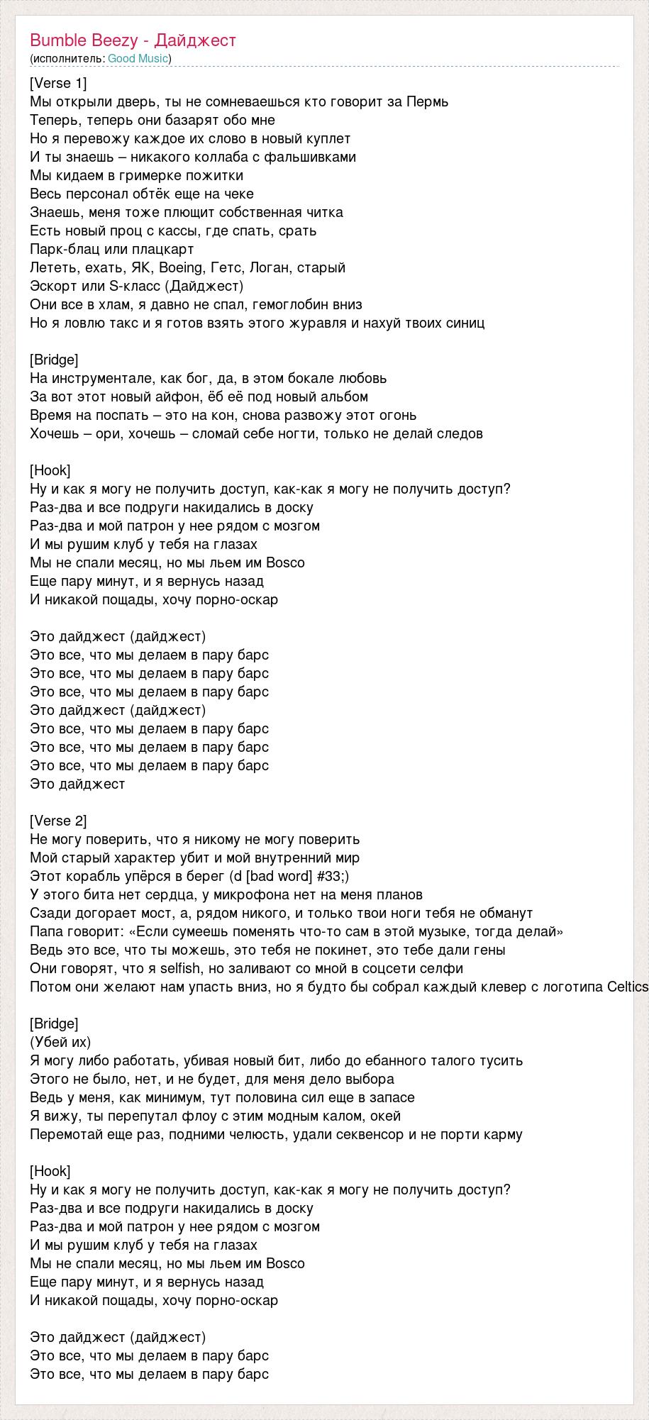 [Verse 1] Мы открыли дверь, ты не сомневаешься кто говорит за Пермь Теперь, теперь они базарят обо мне Но я перевожу каждое их слово в новый куплет И ты знаешь – никакого коллаба с фальшивками Мы кидаем в гримерке пожитки Весь персонал обтёк еще на чеке Знаешь, меня тоже плющит собственная читка Есть новый проц с кассы, где спать, срать Парк-блац или плацкарт Лететь, ехать, ЯК, Boeing, Гетс, Логан, старый Эскорт или S-класс (Дайджест) Они все в хлам, я давно не спал, гемоглобин вниз Но я ловлю такс и я готов взять этого журавля и нахуй твоих синиц [Bridge] На инструментале, как бог, да, в этом бокале любовь За вот этот новый айфон, ёб её под новый альбом Время на поспать – это на кон, снова развожу этот огонь Хочешь – ори, хочешь – сломай себе ногти, только не делай следов [Hook] Ну и как я могу не получить доступ, как-как я могу не получить доступ? Раз-два и все подруги накидались в доску Раз-два и мой патрон у нее рядом с мозгом И мы рушим клуб у тебя на глазах Мы не спали месяц, но мы льем им Bosco Еще пару минут, и я вернусь назад И никакой пощады, хочу порно-оскар Это дайджест (дайджест) Это все, что мы делаем в пару барс Это все, что мы делаем в пару барс Это все, что мы делаем в пару барс Это дайджест (дайджест) Это все, что мы делаем в пару барс Это все, что мы делаем в пару барс Это все, что мы делаем в пару барс Это дайджест [Verse 2] Не могу поверить, что я никому не могу поверить Мой старый характер убит и мой внутренний мир Этот корабль упёрся в берег (d [bad word] #33;) У этого бита нет сердца, у микрофона нет на меня планов Сзади догорает мост, а, рядом никого, и только твои ноги тебя не обманут Папа говорит: «Если сумеешь поменять что-то сам в этой музыке, тогда делай» Ведь это все, что ты можешь, это тебя не покинет, это тебе дали гены Они говорят, что я selfish, но заливают со мной в соцсети селфи Потом они желают нам упасть вниз, но я будто бы собрал каждый клевер с логотипа Celtics [Bridge] (Убей их) Я могу либо работать, убивая новый бит, либо до ебанного талого тусить Этого не было, нет, и не будет, для меня дело выбора Ведь у меня, как минимум, тут половина сил еще в запасе Я вижу, ты перепутал флоу с этим модным калом, окей Перемотай еще раз, подними челюсть, удали секвенсор и не порти карму [Hook] Ну и как я могу не получить доступ, как-как я могу не получить доступ? Раз-два и все подруги накидались в доску Раз-два и мой патрон у нее рядом с мозгом И мы рушим клуб у тебя на глазах Мы не спали месяц, но мы льем им Bosco Еще пару минут, и я вернусь назад И никакой пощады, хочу порно-оскар Это дайджест (дайджест) Это все, что мы делаем в пару барс Это все, что мы делаем в пару барс
