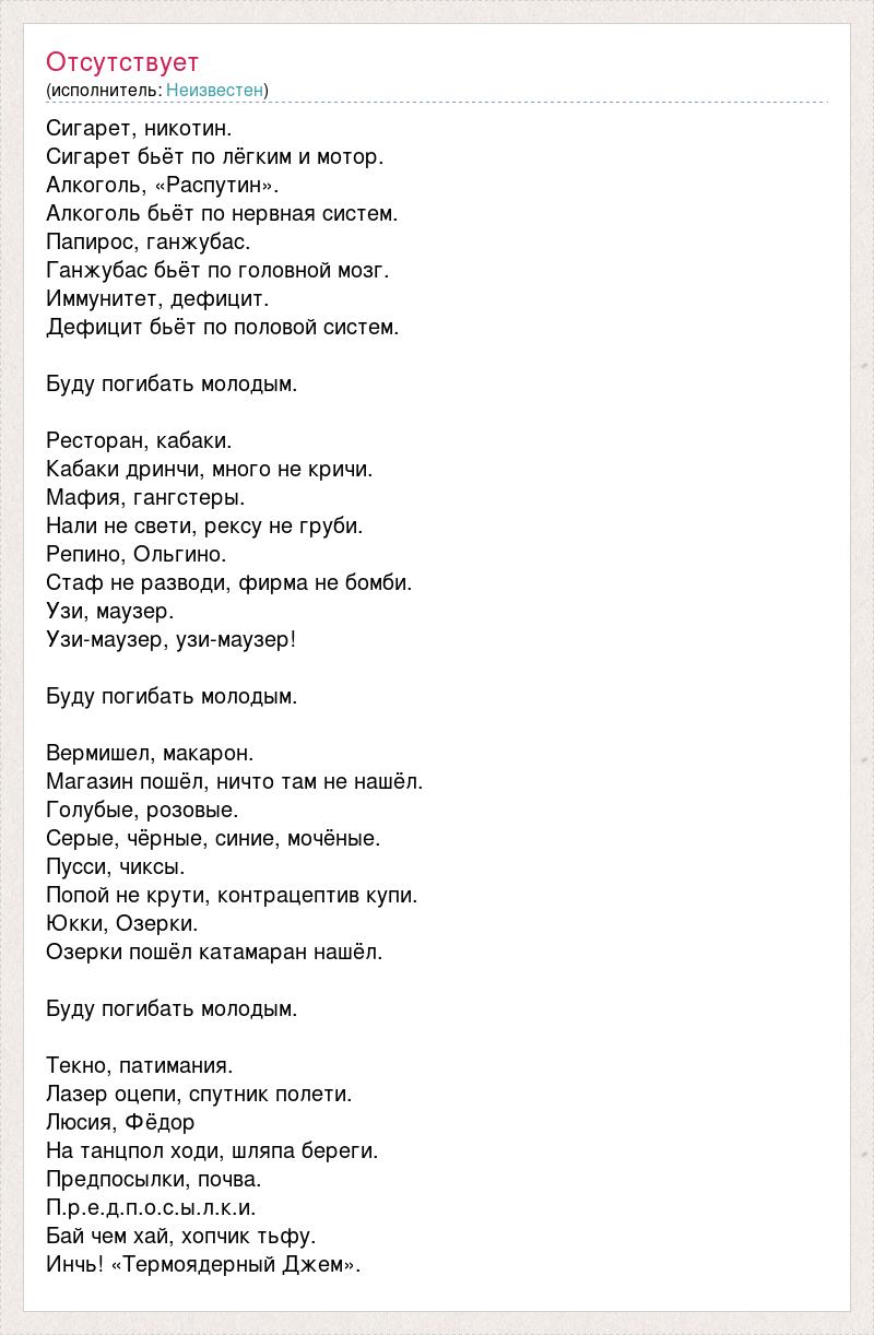 Сигарет, никотин. Сигарет бьёт по лёгким и мотор. Алкоголь, «Распутин». Алкоголь бьёт по нервная систем. Папирос, ганжубас. Ганжубас бьёт по головной мозг. Иммунитет, дефицит. Дефицит бьёт по половой систем. Буду погибать молодым. Ресторан, кабаки. Кабаки дринчи, много не кричи. Мафия, гангстеры. Нали не свети, рексу не груби. Репино, Ольгино. Стаф не разводи, фирма не бомби. Узи, маузер. Узи-маузер, узи-маузер! Буду погибать молодым. Вермишел, макарон. Магазин пошёл, ничто там не нашёл. Голубые, розовые. Серые, чёрные, синие, мочёные. Пусси, чиксы. Попой не крути, контрацептив купи. Юкки, Озерки. Озерки пошёл катамаран нашёл. Буду погибать молодым. Текно, патимания. Лазер оцепи, спутник полети. Люсия, Фёдор На танцпол ходи, шляпа береги. Предпосылки, почва. П.р.е.д.п.о.с.ы.л.к.и. Бай чем хай, хопчик тьфу. Инчь! «Термоядерный Джем».