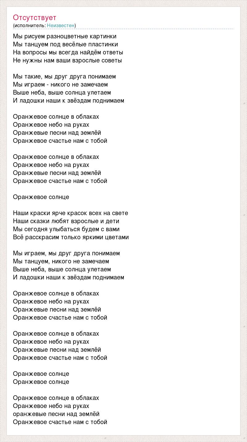 Мы рисуем разноцветные картинки Мы танцуем под весёлые пластинки На вопросы мы всегда найдём ответы Не нужны нам ваши взрослые советы Мы такие, мы друг друга понимаем Мы играем - никого не замечаем Выше неба, выше солнца улетаем И ладошки наши к звёздам поднимаем Оранжевое солнце в облаках Оранжевое небо на руках Оранжевые песни над землёй Оранжевое счастье нам с тобой Оранжевое солнце в облаках Оранжевое небо на руках Оранжевые песни над землёй Оранжевое счастье нам с тобой Оранжевое солнце Наши краски ярче красок всех на свете Наши сказки любят взрослые и дети Мы сегодня улыбаться будем с вами Всё расскрасим только яркими цветами Мы играем, мы друг друга понимаем Мы танцуем, никого не замечаем Выше неба, выше солнца улетаем И ладошки наши к звёздам поднимаем Оранжевое солнце в облаках Оранжевое небо на руках Оранжевые песни над землёй Оранжевое счастье нам с тобой Оранжевое солнце в облаках Оранжевое небо на руках Оранжевые песни над землёй Оранжевое счастье нам с тобой Оранжевое солнце Оранжевое солнце Оранжевое солнце в облаках Оранжевое небо на руках оранжевые песни над землёй Оранжевое счастье нам с тобой