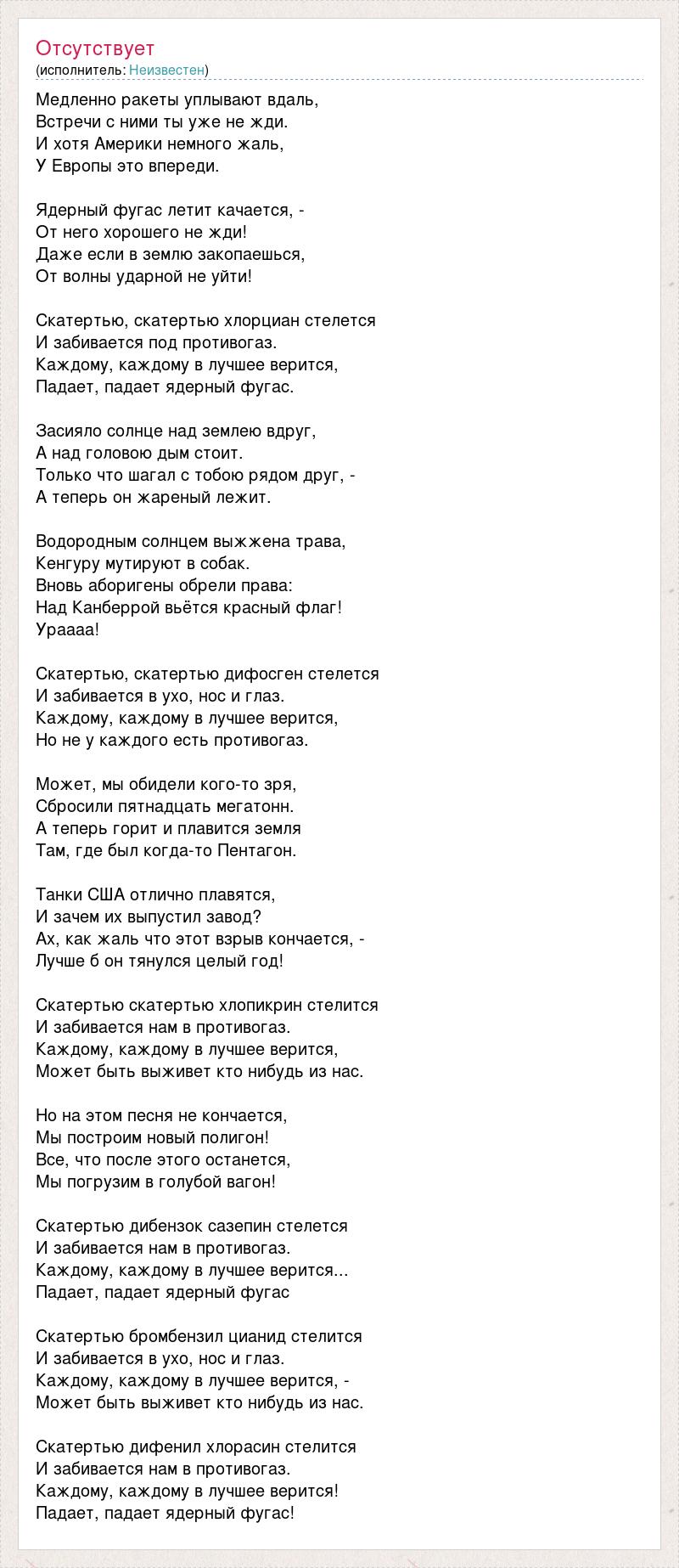 Медленно ракеты уплывают вдаль, Встречи с ними ты уже не жди. И хотя Америки немного жаль, У Европы это впереди. Ядерный фугас летит качается, - От него хорошего не жди! Даже если в землю закопаешься, От волны ударной не уйти! Скатертью, скатертью хлорциан стелется И забивается под противогаз. Каждому, каждому в лучшее верится, Падает, падает ядерный фугас. Засияло солнце над землею вдруг, А над головою дым стоит. Только что шагал с тобою рядом друг, - А теперь он жареный лежит. Водородным солнцем выжжена трава, Кенгуру мутируют в собак. Вновь аборигены обрели права: Над Канберрой вьётся красный флаг! Ураааа! Скатертью, скатертью дифосген стелется И забивается в ухо, нос и глаз. Каждому, каждому в лучшее верится, Но не у каждого есть противогаз. Может, мы обидели кого-то зря, Сбросили пятнадцать мегатонн. А теперь горит и плавится земля Там, где был когда-то Пентагон. Танки США отлично плавятся, И зачем их выпустил завод? Ах, как жаль что этот взрыв кончается, - Лучше б он тянулся целый год! Скатертью скатертью хлопикрин стелится И забивается нам в противогаз. Каждому, каждому в лучшее верится, Может быть выживет кто нибудь из нас. Но на этом песня не кончается, Мы построим новый полигон! Все, что после этого останется, Мы погрузим в голубой вагон! Скатертью дибензок сазепин стелется И забивается нам в противогаз. Каждому, каждому в лучшее верится... Падает, падает ядерный фугас Скатертью бромбензил цианид стелится И забивается в ухо, нос и глаз. Каждому, каждому в лучшее верится, - Может быть выживет кто нибудь из нас. Скатертью дифенил хлорасин стелится И забивается нам в противогаз. Каждому, каждому в лучшее верится! Падает, падает ядерный фугас!
