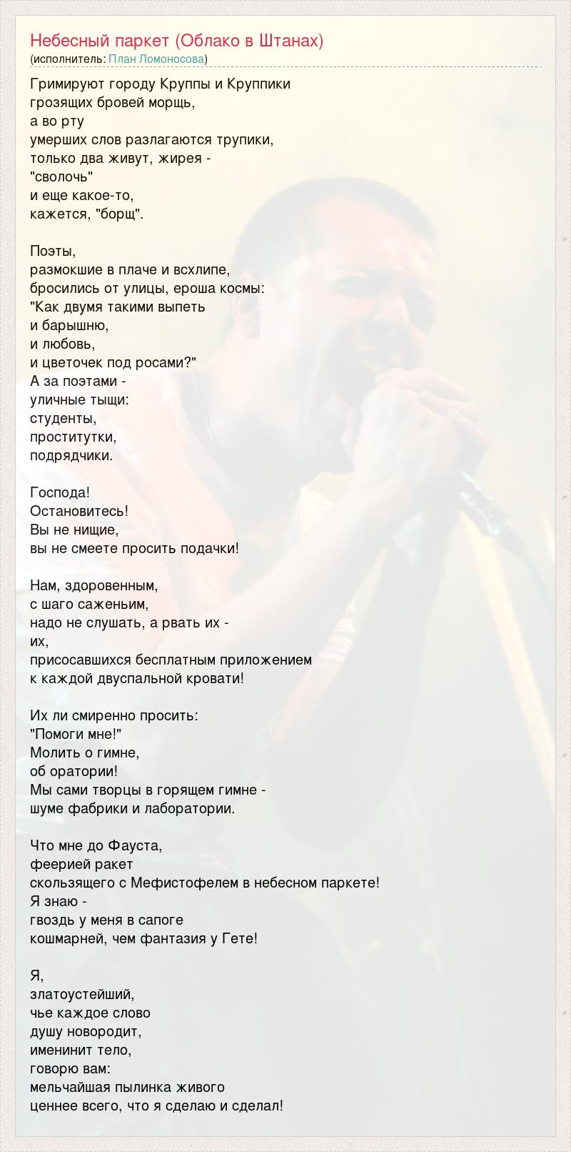 Гримируют городу Круппы и Круппики грозящих бровей морщь, а во рту умерших слов разлагаются трупики, только два живут, жирея - "сволочь" и еще какое-то, кажется, "борщ". Поэты, размокшие в плаче и всхлипе, бросились от улицы, ероша космы: "Как двумя такими выпеть и барышню, и любовь, и цветочек под росами?" А за поэтами - уличные тыщи: студенты, проститутки, подрядчики. Господа! Остановитесь! Вы не нищие, вы не смеете просить подачки! Нам, здоровенным, с шаго саженьим, надо не слушать, а рвать их - их, присосавшихся бесплатным приложением к каждой двуспальной кровати! Их ли смиренно просить: "Помоги мне!" Молить о гимне, об оратории! Мы сами творцы в горящем гимне - шуме фабрики и лаборатории. Что мне до Фауста, феерией ракет скользящего с Мефистофелем в небесном паркете! Я знаю - гвоздь у меня в сапоге кошмарней, чем фантазия у Гете! Я, златоустейший, чье каждое слово душу новородит, именинит тело, говорю вам: мельчайшая пылинка живого ценнее всего, что я сделаю и сделал!