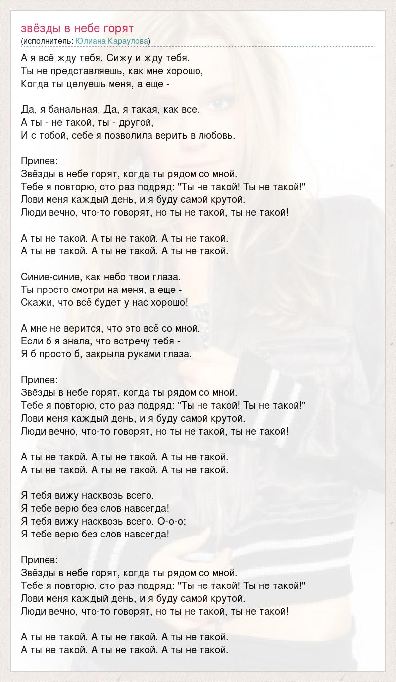 А я всё жду тебя. Сижу и жду тебя. Ты не представляешь, как мне хорошо, Когда ты целуешь меня, а еще - Да, я банальная. Да, я такая, как все. А ты - не такой, ты - другой, И с тобой, себе я позволила верить в любовь. Припев: Звёзды в небе горят, когда ты рядом со мной. Тебе я повторю, сто раз подряд: "Ты не такой! Ты не такой!" Лови меня каждый день, и я буду самой крутой. Люди вечно, что-то говорят, но ты не такой, ты не такой! А ты не такой. А ты не такой. А ты не такой. А ты не такой. А ты не такой. А ты не такой. Синие-синие, как небо твои глаза. Ты просто смотри на меня, а еще - Скажи, что всё будет у нас хорошо! А мне не верится, что это всё со мной. Если б я знала, что встречу тебя - Я б просто б, закрыла руками глаза. Припев: Звёзды в небе горят, когда ты рядом со мной. Тебе я повторю, сто раз подряд: "Ты не такой! Ты не такой!" Лови меня каждый день, и я буду самой крутой. Люди вечно, что-то говорят, но ты не такой, ты не такой! А ты не такой. А ты не такой. А ты не такой. А ты не такой. А ты не такой. А ты не такой. Я тебя вижу насквозь всего. Я тебе верю без слов навсегда! Я тебя вижу насквозь всего. О-о-о; Я тебе верю без слов навсегда! Припев: Звёзды в небе горят, когда ты рядом со мной. Тебе я повторю, сто раз подряд: "Ты не такой! Ты не такой!" Лови меня каждый день, и я буду самой крутой. Люди вечно, что-то говорят, но ты не такой, ты не такой! А ты не такой. А ты не такой. А ты не такой. А ты не такой. А ты не такой. А ты не такой.