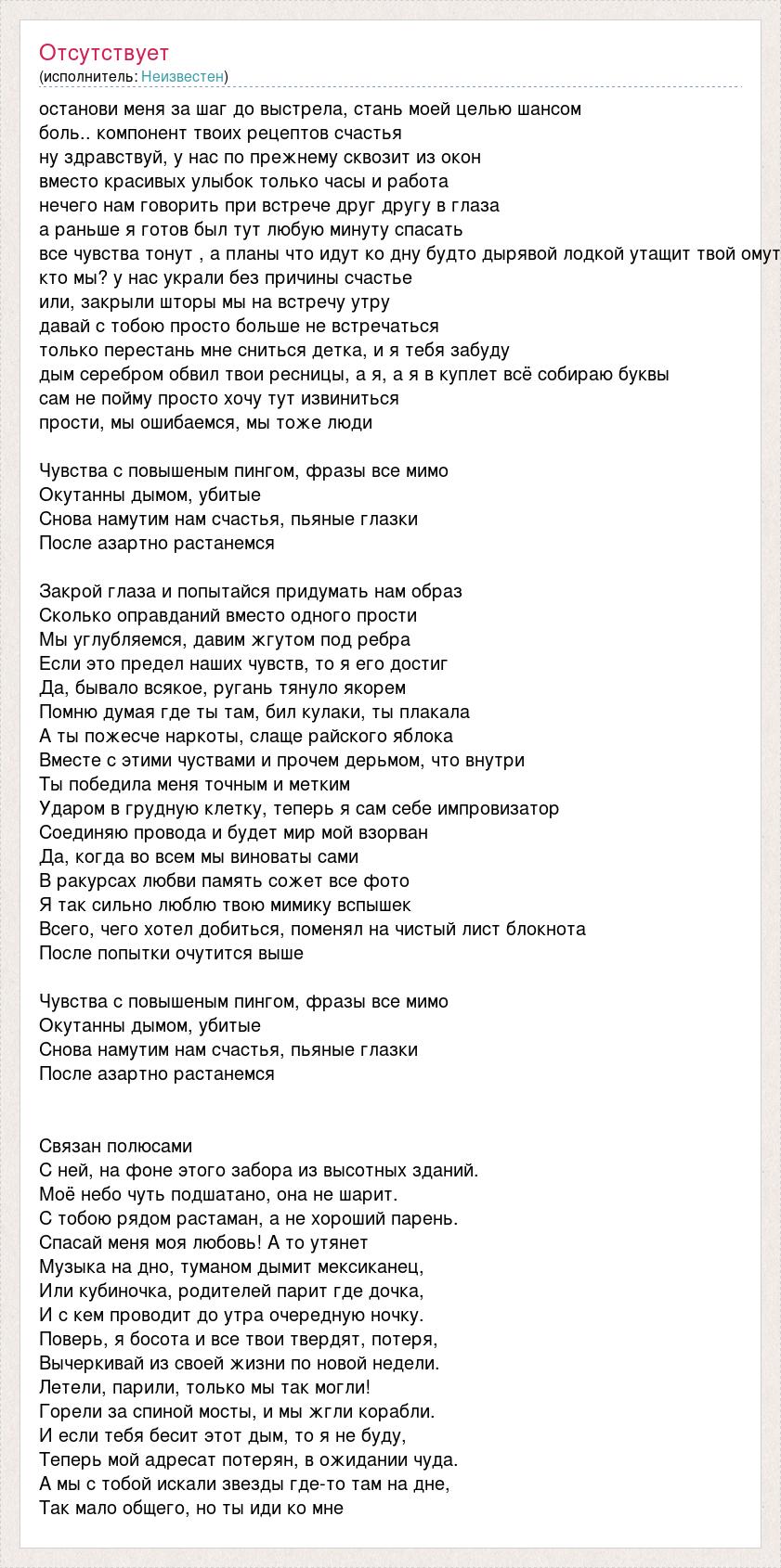 останови меня за шаг до выстрела, стань моей целью шансом боль.. компонент твоих рецептов счастья ну здравствуй, у нас по прежнему сквозит из окон вместо красивых улыбок только часы и работа нечего нам говорить при встрече друг другу в глаза а раньше я готов был тут любую минуту спасать все чувства тонут , а планы что идут ко дну будто дырявой лодкой утащит твой омут кто мы? у нас украли без причины счастье или, закрыли шторы мы на встречу утру давай с тобою просто больше не встречаться только перестань мне сниться детка, и я тебя забуду дым серебром обвил твои ресницы, а я, а я в куплет всё собираю буквы сам не пойму просто хочу тут извиниться прости, мы ошибаемся, мы тоже люди Чувства с повышеным пингом, фразы все мимо Окутанны дымом, убитые Снова намутим нам счастья, пьяные глазки После азартно растанемся Закрой глаза и попытайся придумать нам образ Сколько оправданий вместо одного прости Мы углубляемся, давим жгутом под ребра Если это предел наших чувств, то я его достиг Да, бывало всякое, ругань тянуло якорем Помню думая где ты там, бил кулаки, ты плакала А ты пожесче наркоты, слаще райского яблока Вместе с этими чуствами и прочем дерьмом, что внутри Ты победила меня точным и метким Ударом в грудную клетку, теперь я сам себе импровизатор Соединяю провода и будет мир мой взорван Да, когда во всем мы виноваты сами В ракурсах любви память сожет все фото Я так сильно люблю твою мимику вспышек Всего, чего хотел добиться, поменял на чистый лист блокнота После попытки очутится выше Чувства с повышеным пингом, фразы все мимо Окутанны дымом, убитые Снова намутим нам счастья, пьяные глазки После азартно растанемся Связан полюсами С ней, на фоне этого забора из высотных зданий. Моё небо чуть подшатано, она не шарит. С тобою рядом растаман, а не хороший парень. Спасай меня моя любовь! А то утянет Музыка на дно, туманом дымит мексиканец, Или кубиночка, родителей парит где дочка, И с кем проводит до утра очередную ночку. Поверь, я босота и все твои твердят, потеря, Вычеркивай из своей жизни по новой недели. Летели, парили, только мы так могли! Горели за спиной мосты, и мы жгли корабли. И если тебя бесит этот дым, то я не буду, Теперь мой адресат потерян, в ожидании чуда. А мы с тобой искали звезды где-то там на дне, Так мало общего, но ты иди ко мне