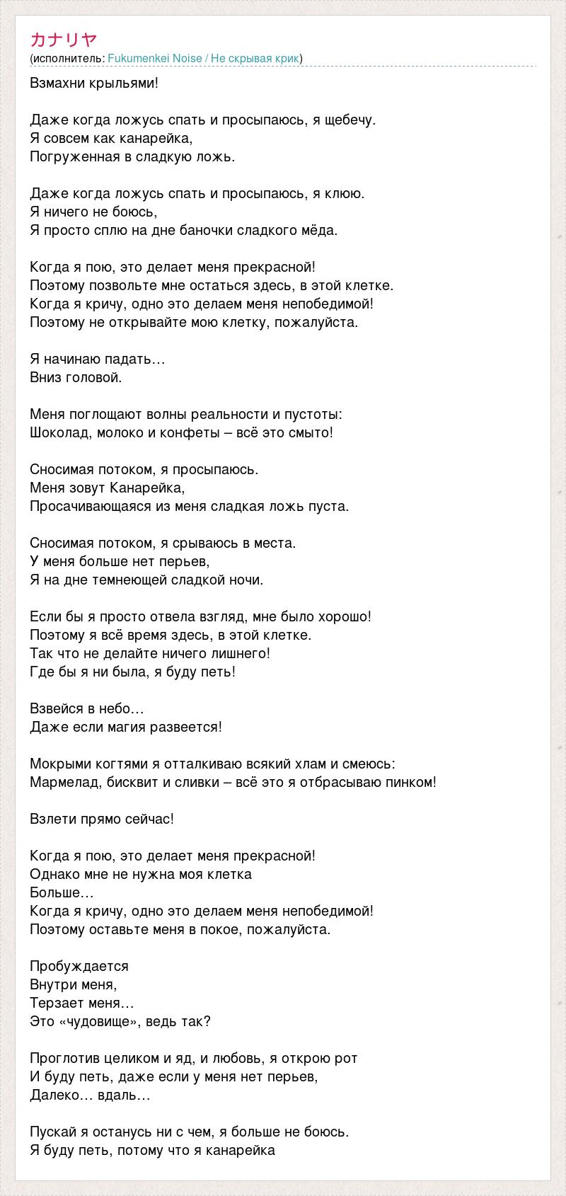Взмахни крыльями! Даже когда ложусь спать и просыпаюсь, я щебечу. Я совсем как канарейка, Погруженная в сладкую ложь. Даже когда ложусь спать и просыпаюсь, я клюю. Я ничего не боюсь, Я просто сплю на дне баночки сладкого мёда. Когда я пою, это делает меня прекрасной! Поэтому позвольте мне остаться здесь, в этой клетке. Когда я кричу, одно это делаем меня непобедимой! Поэтому не открывайте мою клетку, пожалуйста. Я начинаю падать… Вниз головой. Меня поглощают волны реальности и пустоты: Шоколад, молоко и конфеты – всё это смыто! Сносимая потоком, я просыпаюсь. Меня зовут Канарейка, Просачивающаяся из меня сладкая ложь пуста. Сносимая потоком, я срываюсь в места. У меня больше нет перьев, Я на дне темнеющей сладкой ночи. Если бы я просто отвела взгляд, мне было хорошо! Поэтому я всё время здесь, в этой клетке. Так что не делайте ничего лишнего! Где бы я ни была, я буду петь! Взвейся в небо… Даже если магия развеется! Мокрыми когтями я отталкиваю всякий хлам и смеюсь: Мармелад, бисквит и сливки – всё это я отбрасываю пинком! Взлети прямо сейчас! Когда я пою, это делает меня прекрасной! Однако мне не нужна моя клетка Больше… Когда я кричу, одно это делаем меня непобедимой! Поэтому оставьте меня в покое, пожалуйста. Пробуждается Внутри меня, Терзает меня… Это «чудовище», ведь так? Проглотив целиком и яд, и любовь, я открою рот И буду петь, даже если у меня нет перьев, Далеко… вдаль… Пускай я останусь ни с чем, я больше не боюсь. Я буду петь, потому что я канарейка