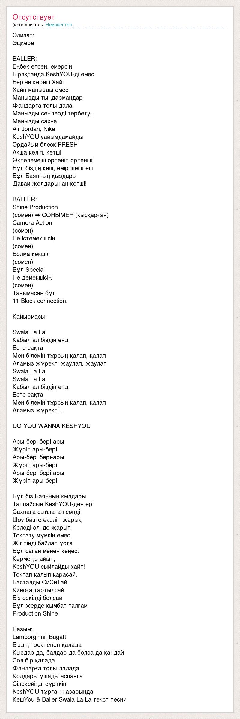 Элизат: Эщкере BALLER: Еңбек етсең, емерсің Бiрақтанда KeshYOU-ді емес Бәріне керегі Хайп Хайп маңызды емес Маңызды тыңдармандар Фандарға толы дала Маңызды сендерді тербету, Маңызды саxна! Air Jordan, Nike КеshYOU уайымдамайды Әрдайым блеск FRESH Ақша келіп, кетші Өкпелемеші өртеніп өртенші Бұл біздің кеш, өмiр шешпеш Бұл Баянның қыздары Давай жолдарынан кетші! BALLER: Shine Production (сомен) ➡ СОНЫМЕН (қысқарған) Camera Action (сомен) Не істемекшісің (сомен) Болма кекшіл (сомен) Бұл Special Не демекшісің (сомен) Танымасаң бұл 11 Block connection. Қайырмасы: Swala La La Қабыл ал біздің әнді Есте сақта Мен білемін тұрсың қалап, қалап Аламыз жүректі жаулап, жаулап Swala La La Swala La La Қабыл ал біздің әнді Есте сақта Мен білемін тұрсың қалап, қалап Аламыз жүректі... DO YOU WANNA KESHYOU Ары-бері бері-ары Жүріп ары-бері Ары-бері бері-ары Жүріп ары-бері Ары-бері бері-ары Жүріп ары-бері Бұл бiз Баянның қыздары Таппайсың KeshYOU-ден әрі Саxнаға сыйлаған сәнді Шоу бизге әкеліп жарық Келеді әлі де жарып Тоқтату мүмкін емес Жігітіңді байлап ұста Бұл саған менен кеңес. Көрмеңіз айып, KeshYOU сыйлайды xайп! Тоқтап қалып қарасай, Басталды СиСиТай Киноға тартылсай Біз секілді болсай Бұл жерде қымбат талғам Production Shine Назым: Lamborghini, Bugatti Біздiң трекпенен қалада Қыздар да, балдар да болса да қандай Сол бір қалада Фандарға толы далада Қолдары ұшады аспанға Сілекейіңді сүрткін KeshYOU тұрған назарыңда. КешYou & Baller Swala La La текст песни
