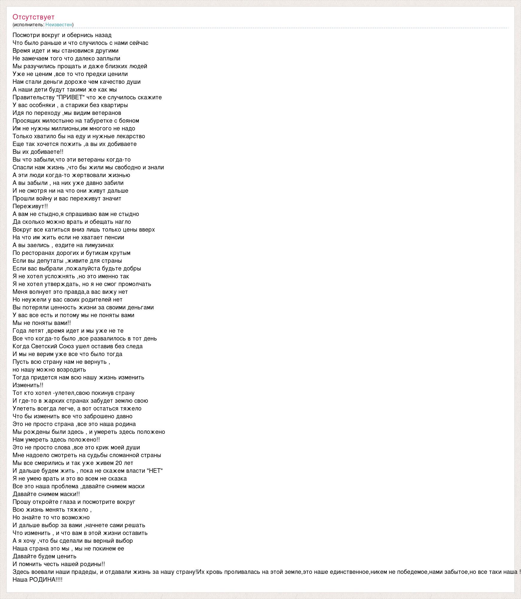 Посмотри вокруг и обернись назад Что было раньше и что случилось с нами сейчас Время идет и мы становимся другими Не замечаем того что далеко заплыли Мы разучились прощать и даже близких людей Уже не ценим ,все то что предки ценили Нам стали деньги дороже чем качество души А наши дети будут такими же как мы Правительству "ПРИВЕТ" что же случилось скажите У вас особняки , а старики без квартиры Идя по переходу ,мы видим ветеранов Просящих милостыню на табуретке с бояном Им не нужны миллионы,им многого не надо Только хватило бы на еду и нужные лекарство Еще так хочется пожить ,а вы их добиваете Вы их добиваете!! Вы что забыли,что эти ветераны когда-то Спасли нам жизнь ,что бы жили мы свободно и знали А эти люди когда-то жертвовали жизнью А вы забыли , на них уже давно забили И не смотря ни на что они живут дальше Прошли войну и вас переживут значит Переживут!! А вам не стыдно,я спрашиваю вам не стыдно Да сколько можно врать и обещать нагло Вокруг все катиться вниз лишь только цены вверх На что им жить если не хватает пенсии А вы заелись , ездите на лимузинах По ресторанах дорогих и бутикам крутым Если вы депутаты ,живите для страны Если вас выбрали ,пожалуйста будьте добры Я не хотел усложнять ,но это именно так Я не хотел утверждать, но я не смог промолчать Меня волнует это правда,а вас вижу нет Но неужели у вас своих родителей нет Вы потеряли ценность жизни за своими деньгами У вас все есть и потому мы не поняты вами Мы не поняты вами!! Года летят ,время идет и мы уже не те Все что когда-то было ,все развалилось в тот день Когда Светский Союз ушел оставив без следа И мы не верим уже все что было тогда Пусть всю страну нам не вернуть , но нашу можно возродить Тогда придется нам всю нашу жизнь изменить Изменить!! Тот кто хотел -улетел,свою покинув страну И где-то в жарких странах забудет землю свою Улететь всегда легче, а вот остаться тяжело Что бы изменить все что заброшено давно Это не просто страна ,все это наша родина Мы рождены были здесь , и умереть здесь положено Нам умереть здесь положено!! Это не просто слова ,все это крик моей души Мне надоело смотреть на судьбы сломанной страны Мы все смерились и так уже живем 20 лет И дальше будем жить , пока не скажем власти "НЕТ" Я не умею врать и это во всем не сказка Все это наша проблема ,давайте снимем маски Давайте снимем маски!! Прошу откройте глаза и посмотрите вокруг Всю жизнь менять тяжело , Но знайте то что возможно И дальше выбор за вами ,начнете сами решать Что изменить , и что вам в этой жизни оставить А я хочу ,что бы сделали вы верный выбор Наша страна это мы , мы не покинем ее Давайте будем ценить И помнить честь нашей родины!! Здесь воевали наши прадеды, и отдавали жизнь за нашу страну!Их кровь проливалась на этой земле,это наше единственное,никем не победемое,нами забытое,но все таки наша ! Наша РОДИНА!!!!