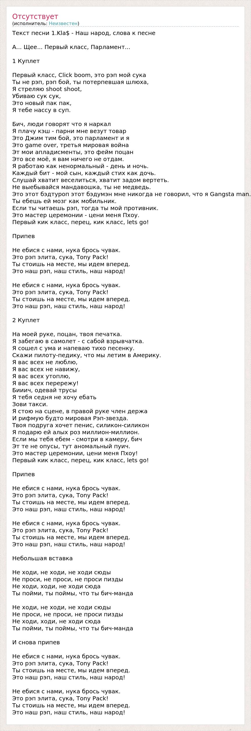Текст песни 1.Kla$ - Наш народ, слова к песне А... Щее... Первый класс, Парламент... 1 Куплет Первый класс, Click boom, это рэп мой сука Ты не рэп, рэп бой, ты потерпевшая шлюха, Я стреляю shoot shoot, Убиваю сук сук, Это новый пак пак, Я тебе нассу в суп. Бич, люди говорят что я наркал Я плачу кэш - парни мне везут товар Это Джим тим бой, это парламент и я Это game over, третья мировая война Эт мои апладисменты, это фейм поцан Это все моё, я вам ничего не отдам. Я работаю как ненормальный - день и ночь. Каждый бит - мой сын, каждый стих как дочь. Слушай хватит веселиться, хватит задом вертеть. Не выебывайся мандавошка, ты не медведь. Это этот бэдтуроп этот бэдумэн мне никогда не говорил, что я Gangsta man. Ты ебешь ей мозг как мобильник. Если ты читаешь рэп, тогда ты мой противник. Это мастер церемонии - цени меня Пхоу. Первый кик класс, перец, кик класс, lets go! Припев Не ебися с нами, нука брось чувак. Это рэп элита, сука, Tony Pack! Ты стоишь на месте, мы идем вперед. Это наш рэп, наш стиль, наш народ! Не ебися с нами, нука брось чувак. Это рэп элита, сука, Tony Pack! Ты стоишь на месте, мы идем вперед. Это наш рэп, наш стиль, наш народ! 2 Куплет На моей руке, поцан, твоя печатка. Я забегаю в самолет - с сабой взрывчатка. Я сошел с ума и напеваю тихо песенку. Скажи пилоту-педику, что мы летим в Америку. Я вас всех не люблю, Я вас всех не навижу, Я вас всех утоплю, Я вас всех перережу! Бииич, одевай трусы Я тебя седня не хочу ебать Зови такси. Я стою на сцене, в правой руке член держа И рифмую будто мировая Рэп-звезда. Твоя подруга хочет пенис, силикон-силикон Я подарю ей алых роз миллион-миллион. Если мы тебя ебем - смотри в камеру, бич Эт те не опусы, тут аномальный пуич. Это мастер церемонии, цени меня Пхоу! Первый кик класс, перец, кик класс, lets go! Припев Не ебися с нами, нука брось чувак. Это рэп элита, сука, Tony Pack! Ты стоишь на месте, мы идем вперед. Это наш рэп, наш стиль, наш народ! Не ебися с нами, нука брось чувак. Это рэп элита, сука, Tony Pack! Ты стоишь на месте, мы идем вперед. Это наш рэп, наш стиль, наш народ! Небольшая вставка Не ходи, не ходи, не ходи сюды Не проси, не проси, не проси пизды Не ходи, ходи, не ходи сюда Ты пойми, ты поймы, что ты бич-манда Не ходи, не ходи, не ходи сюды Не проси, не проси, не проси пизды Не ходи, ходи, не ходи сюда Ты пойми, ты поймы, что ты бич-манда И снова припев Не ебися с нами, нука брось чувак. Это рэп элита, сука, Tony Pack! Ты стоишь на месте, мы идем вперед. Это наш рэп, наш стиль, наш народ! Не ебися с нами, нука брось чувак. Это рэп элита, сука, Tony Pack! Ты стоишь на месте, мы идем вперед. Это наш рэп, наш стиль, наш народ!