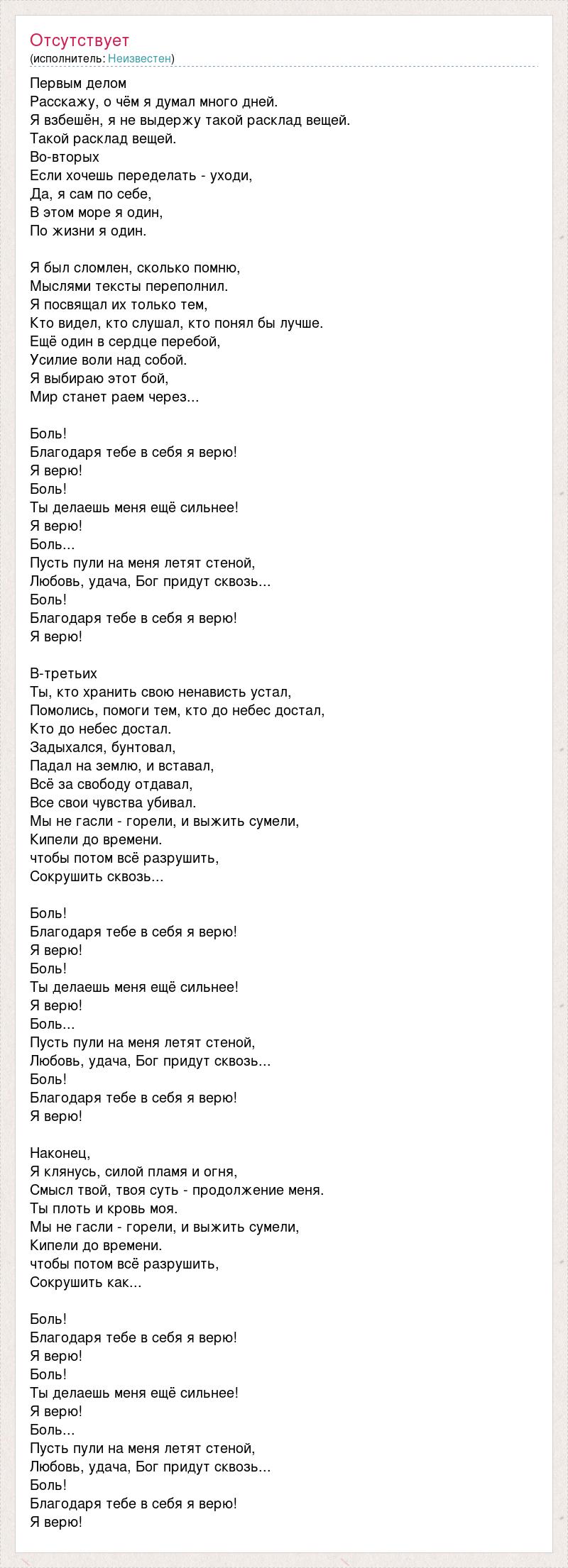 Первым делом Расскажу, о чём я думал много дней. Я взбешён, я не выдержу такой расклад вещей. Такой расклад вещей. Во-вторых Если хочешь переделать - уходи, Да, я сам по себе, В этом море я один, По жизни я один. Я был сломлен, сколько помню, Мыслями тексты переполнил. Я посвящал их только тем, Кто видел, кто слушал, кто понял бы лучше. Ещё один в сердце перебой, Усилие воли над собой. Я выбираю этот бой, Мир станет раем через... Боль! Благодаря тебе в себя я верю! Я верю! Боль! Ты делаешь меня ещё сильнее! Я верю! Боль... Пусть пули на меня летят стеной, Любовь, удача, Бог придут сквозь... Боль! Благодаря тебе в себя я верю! Я верю! В-третьих Ты, кто хранить свою ненависть устал, Помолись, помоги тем, кто до небес достал, Кто до небес достал. Задыхался, бунтовал, Падал на землю, и вставал, Всё за свободу отдавал, Все свои чувства убивал. Мы не гасли - горели, и выжить сумели, Кипели до времени. чтобы потом всё разрушить, Сокрушить сквозь... Боль! Благодаря тебе в себя я верю! Я верю! Боль! Ты делаешь меня ещё сильнее! Я верю! Боль... Пусть пули на меня летят стеной, Любовь, удача, Бог придут сквозь... Боль! Благодаря тебе в себя я верю! Я верю! Наконец, Я клянусь, силой пламя и огня, Смысл твой, твоя суть - продолжение меня. Ты плоть и кровь моя. Мы не гасли - горели, и выжить сумели, Кипели до времени. чтобы потом всё разрушить, Сокрушить как... Боль! Благодаря тебе в себя я верю! Я верю! Боль! Ты делаешь меня ещё сильнее! Я верю! Боль... Пусть пули на меня летят стеной, Любовь, удача, Бог придут сквозь... Боль! Благодаря тебе в себя я верю! Я верю!