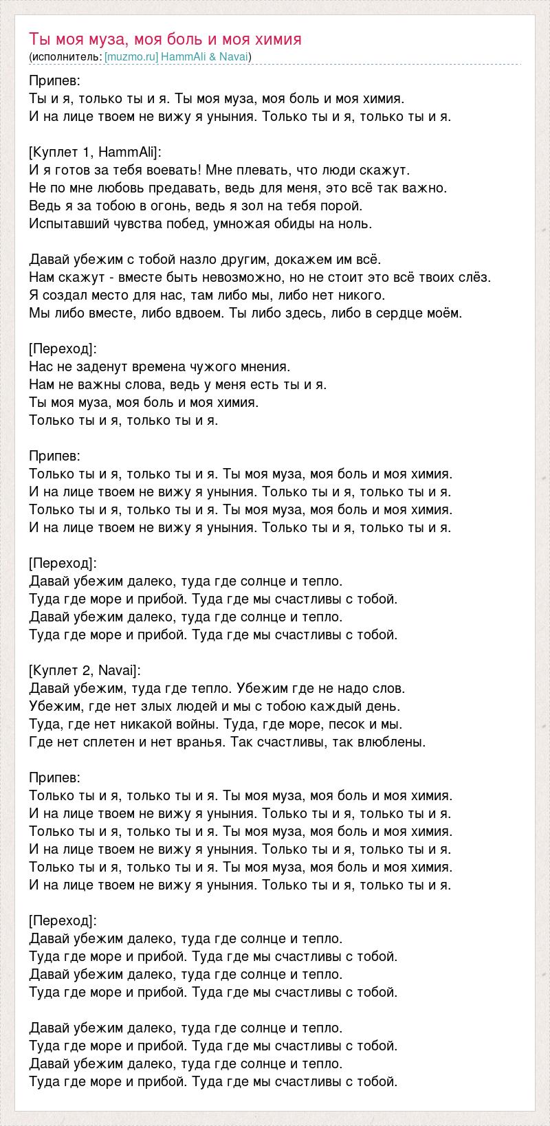 Припев: Ты и я, только ты и я. Ты моя муза, моя боль и моя химия. И на лице твоем не вижу я уныния. Только ты и я, только ты и я. [Куплет 1, HammAli]: И я готов за тебя воевать! Мне плевать, что люди скажут. Не по мне любовь предавать, ведь для меня, это всё так важно. Ведь я за тобою в огонь, ведь я зол на тебя порой. Испытавший чувства побед, умножая обиды на ноль. Давай убежим с тобой назло другим, докажем им всё. Нам скажут - вместе быть невозможно, но не стоит это всё твоих слёз. Я создал место для нас, там либо мы, либо нет никого. Мы либо вместе, либо вдвоем. Ты либо здесь, либо в сердце моём. [Переход]: Нас не заденут времена чужого мнения. Нам не важны слова, ведь у меня есть ты и я. Ты моя муза, моя боль и моя химия. Только ты и я, только ты и я. Припев: Только ты и я, только ты и я. Ты моя муза, моя боль и моя химия. И на лице твоем не вижу я уныния. Только ты и я, только ты и я. Только ты и я, только ты и я. Ты моя муза, моя боль и моя химия. И на лице твоем не вижу я уныния. Только ты и я, только ты и я. [Переход]: Давай убежим далеко, туда где солнце и тепло. Туда где море и прибой. Туда где мы счастливы с тобой. Давай убежим далеко, туда где солнце и тепло. Туда где море и прибой. Туда где мы счастливы с тобой. [Куплет 2, Navai]: Давай убежим, туда где тепло. Убежим где не надо слов. Убежим, где нет злых людей и мы с тобою каждый день. Туда, где нет никакой войны. Туда, где море, песок и мы. Где нет сплетен и нет вранья. Так счастливы, так влюблены. Припев: Только ты и я, только ты и я. Ты моя муза, моя боль и моя химия. И на лице твоем не вижу я уныния. Только ты и я, только ты и я. Только ты и я, только ты и я. Ты моя муза, моя боль и моя химия. И на лице твоем не вижу я уныния. Только ты и я, только ты и я. Только ты и я, только ты и я. Ты моя муза, моя боль и моя химия. И на лице твоем не вижу я уныния. Только ты и я, только ты и я. [Переход]: Давай убежим далеко, туда где солнце и тепло. Туда где море и прибой. Туда где мы счастливы с тобой. Давай убежим далеко, туда где солнце и тепло. Туда где море и прибой. Туда где мы счастливы с тобой. Давай убежим далеко, туда где солнце и тепло. Туда где море и прибой. Туда где мы счастливы с тобой. Давай убежим далеко, туда где солнце и тепло. Туда где море и прибой. Туда где мы счастливы с тобой.