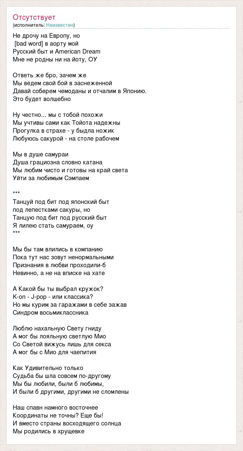 Не дрочу на Европу, но [bad word] в аорту мой Русский быт и American Dream Мне не родны ни на йоту, ОУ Ответь же бро, зачем же Мы ведем свой бой в заснеженной Давай соберем чемоданы и отчалим в Японию. Это будет волшебно Ну честно... мы с тобой похожи Мы учтивы сами как Тойота надежны Прогулка в страхе - у быдла ножик Любуюсь сакурой - на столе рабочем Мы в душе самураи Душа грациозна словно катана Мы любим чисто и готовы на край света Уйти за любимым Сэмпаем *** Танцуй под бит под японский быт под лепестками сакуры, но Танцую под бит под русский быт Я лилею стать самураем, оу *** Мы бы там влились в компанию Пока тут нас зовут ненормальными Признания в любви проходили-б Невинно, а не на вписке на хате А Какой бы ты выбрал кружок? K-on - J-pop - или классика? Но мы курим за гаражами в себе зажав Cиндром восьмиклассника Люблю нахальную Свету гниду А мог бы лояльную светлую Мио Со Светой вижусь лишь для секса А мог бы с Мио для чаепития Как Удивительно только Судьба бы шла совсем по-другому Мы бы любили, были б любимы, И были б другими, другими не сломлены Наш спавн намного восточнее Координаты не точны? Еще бы! И вместо страны восходящего солнца Мы родились в хрущевке