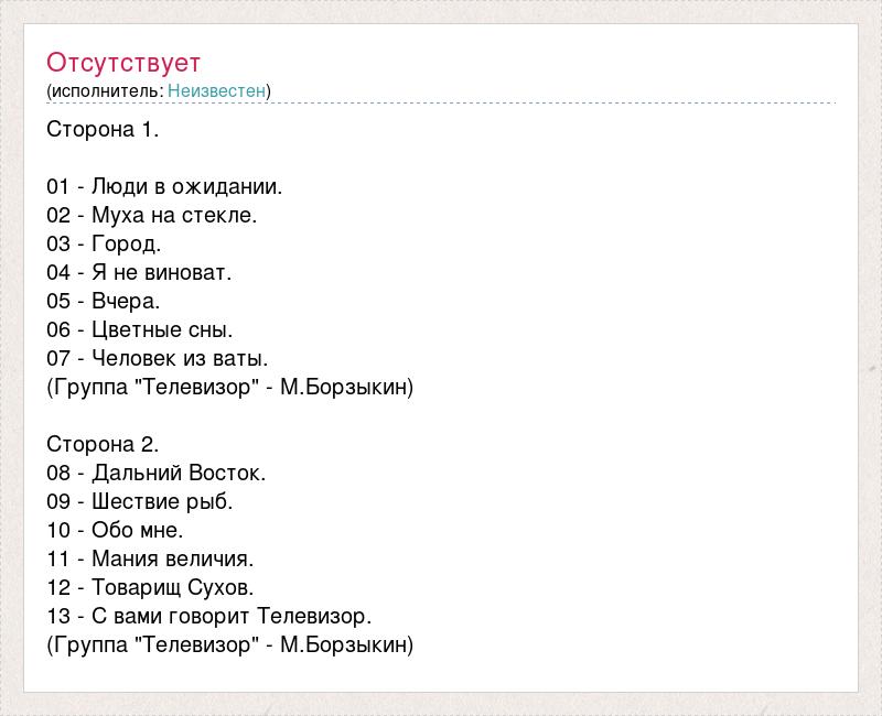 Сторона 1. 01 - Люди в ожидании. 02 - Муха на стекле. 03 - Город. 04 - Я не виноват. 05 - Вчера. 06 - Цветные сны. 07 - Человек из ваты. (Группа "Телевизор" - М.Борзыкин) Сторона 2. 08 - Дальний Восток. 09 - Шествие рыб. 10 - Обо мне. 11 - Мания величия. 12 - Товарищ Сухов. 13 - С вами говорит Телевизор. (Группа "Телевизор" - М.Борзыкин)