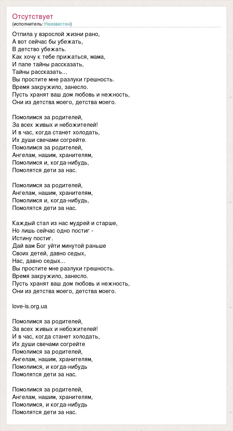 Отпила у взрослой жизни рано, А вот сейчас бы убежать, В детство убежать. Как хочу к тебе прижаться, мама, И папе тайны рассказать, Тайны рассказать... Вы простите мне разлуки грешность. Время закружило, занесло. Пусть хранят ваш дом любовь и нежность, Они из детства моего, детства моего. Помолимся за родителей, За всех живых и небожителей! И в час, когда станет холодать, Их души свечами согрейте. Помолимся за родителей, Ангелам, нашим, хранителям, Помолимся и, когда-нибудь, Помолятся дети за нас. Помолимся за родителей, Ангелам, нашим, хранителям, Помолимся и, когда-нибудь, Помолятся дети за нас. Каждый стал из нас мудрей и старше, Но лишь сейчас одно постиг - Истину постиг. Дай вам Бог уйти минутой раньше Своих детей, давно седых, Нас, давно седых... Вы простите мне разлуки грешность. Время закружило, занесло. Пусть хранят ваш дом любовь и нежность, Они из детства моего, детства моего. love-is.org.ua Помолимся за родителей, За всех живых и небожителей! И в час, когда станет холодать, Их души свечами согрейте Помолимся за родителей, Ангелам, нашим, хранителям, Помолимся, и когда-нибудь Помолятся дети за нас. Помолимся за родителей, Ангелам, нашим, хранителям, Помолимся, и когда-нибудь Помолятся дети за нас.