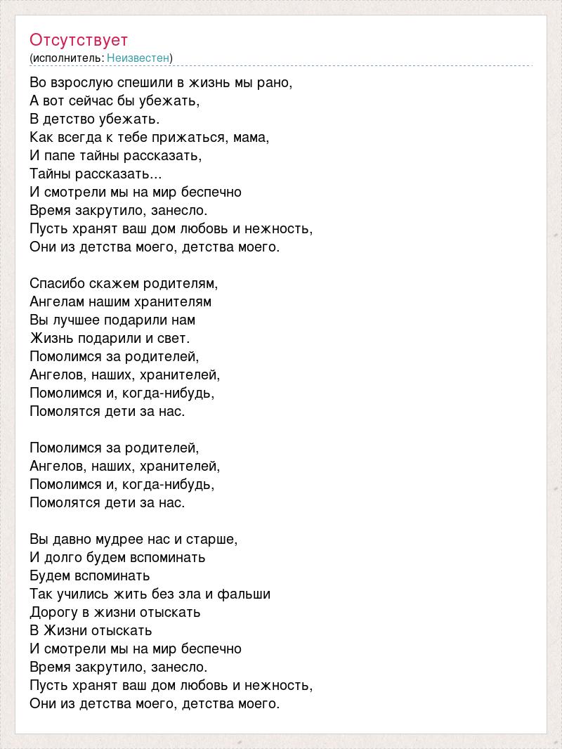 Во взрослую спешили в жизнь мы рано, А вот сейчас бы убежать, В детство убежать. Как всегда к тебе прижаться, мама, И папе тайны рассказать, Тайны рассказать... И смотрели мы на мир беспечно Время закрутило, занесло. Пусть хранят ваш дом любовь и нежность, Они из детства моего, детства моего. Спасибо скажем родителям, Ангелам нашим хранителям Вы лучшее подарили нам Жизнь подарили и свет. Помолимся за родителей, Ангелов, наших, хранителей, Помолимся и, когда-нибудь, Помолятся дети за нас. Помолимся за родителей, Ангелов, наших, хранителей, Помолимся и, когда-нибудь, Помолятся дети за нас. Вы давно мудрее нас и старше, И долго будем вспоминать Будем вспоминать Так учились жить без зла и фальши Дорогу в жизни отыскать В Жизни отыскать И смотрели мы на мир беспечно Время закрутило, занесло. Пусть хранят ваш дом любовь и нежность, Они из детства моего, детства моего.