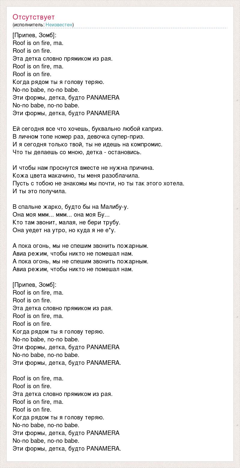 [Припев, Зомб]: Roof is on fire, ma. Roof is on fire. Эта детка словно прямиком из рая. Roof is on fire, ma. Roof is on fire. Когда рядом ты я голову теряю. No-no babe, no-no babe. Эти формы, детка, будто PANAMERA No-no babe, no-no babe. Эти формы, детка, будто PANAMERA Ей сегодня все что хочешь, буквально любой каприз. В личном топе номер раз, девочка супер-приз. И я сегодня только твой, ты не идешь на компромис. Что ты делаешь со мною, детка - остановись. И чтобы нам проснутся вместе не нужна причина. Кожа цвета макачино, ты меня разоблачила. Пусть с тобою не знакомы мы почти, но ты так этого хотела. И ты это получила. В спальне жарко, будто бы на Малибу-у. Она моя ммм... ммм... она моя Бу... Кто там звонит, малая, не бери трубу. Она уедет на утро, но куда я не е*у. А пока огонь, мы не спешим звонить пожарным. Авиа режим, чтобы никто не помешал нам. А пока огонь, мы не спешим звонить пожарным. Авиа режим, чтобы никто не помешал нам. [Припев, Зомб]: Roof is on fire, ma. Roof is on fire. Эта детка словно прямиком из рая. Roof is on fire, ma. Roof is on fire. Когда рядом ты я голову теряю. No-no babe, no-no babe. Эти формы, детка, будто PANAMERA No-no babe, no-no babe. Эти формы, детка, будто PANAMERA. Roof is on fire, ma. Roof is on fire. Эта детка словно прямиком из рая. Roof is on fire, ma. Roof is on fire. Когда рядом ты я голову теряю. No-no babe, no-no babe. Эти формы, детка, будто PANAMERA No-no babe, no-no babe. Эти формы, детка, будто PANAMERA.