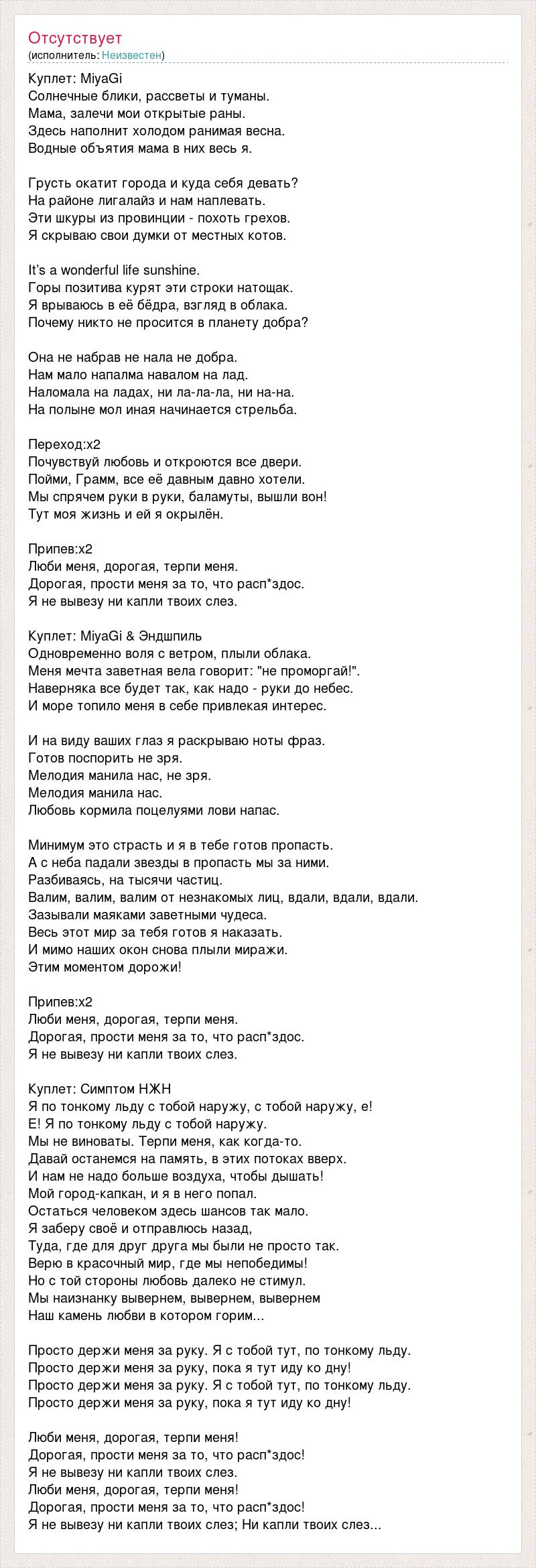 Куплет: MiyaGi Солнечные блики, рассветы и туманы. Мама, залечи мои открытые раны. Здесь наполнит холодом ранимая весна. Водные объятия мама в них весь я. Грусть окатит города и куда себя девать? На районе лигалайз и нам наплевать. Эти шкуры из провинции - похоть грехов. Я скрываю свои думки от местных котов. It’s a wonderful life sunshine. Горы позитива курят эти строки натощак. Я врываюсь в её бёдра, взгляд в облака. Почему никто не просится в планету добра? Она не набрав не нала не добра. Нам мало напалма навалом на лад. Наломала на ладах, ни ла-ла-ла, ни на-на. На полыне мол иная начинается стрельба. Переход:х2 Почувствуй любовь и откроются все двери. Пойми, Грамм, все её давным давно хотели. Мы спрячем руки в руки, баламуты, вышли вон! Тут моя жизнь и ей я окрылён. Припев:х2 Люби меня, дорогая, терпи меня. Дорогая, прости меня за то, что расп*здос. Я не вывезу ни капли твоих слез. Куплет: MiyaGi & Эндшпиль Одновременно воля с ветром, плыли облака. Меня мечта заветная вела говорит: "не проморгай!". Наверняка все будет так, как надо - руки до небес. И море топило меня в себе привлекая интерес. И на виду ваших глаз я раскрываю ноты фраз. Готов поспорить не зря. Мелодия манила нас, не зря. Мелодия манила нас. Любовь кормила поцелуями лови напас. Минимум это страсть и я в тебе готов пропасть. А с неба падали звезды в пропасть мы за ними. Разбиваясь, на тысячи частиц. Валим, валим, валим от незнакомых лиц, вдали, вдали, вдали. Зазывали маяками заветными чудеса. Весь этот мир за тебя готов я наказать. И мимо наших окон снова плыли миражи. Этим моментом дорожи! Припев:х2 Люби меня, дорогая, терпи меня. Дорогая, прости меня за то, что расп*здос. Я не вывезу ни капли твоих слез. Куплет: Симптом НЖН Я по тонкому льду с тобой наружу, с тобой наружу, е! Е! Я по тонкому льду с тобой наружу. Мы не виноваты. Терпи меня, как когда-то. Давай останемся на память, в этих потоках вверх. И нам не надо больше воздуха, чтобы дышать! Мой город-капкан, и я в него попал. Остаться человеком здесь шансов так мало. Я заберу своё и отправлюсь назад, Туда, где для друг друга мы были не просто так. Верю в красочный мир, где мы непобедимы! Но с той стороны любовь далеко не стимул. Мы наизнанку вывернем, вывернем, вывернем Наш камень любви в котором горим... Просто держи меня за руку. Я с тобой тут, по тонкому льду. Просто держи меня за руку, пока я тут иду ко дну! Просто держи меня за руку. Я с тобой тут, по тонкому льду. Просто держи меня за руку, пока я тут иду ко дну! Люби меня, дорогая, терпи меня! Дорогая, прости меня за то, что расп*здос! Я не вывезу ни капли твоих слез. Люби меня, дорогая, терпи меня! Дорогая, прости меня за то, что расп*здос! Я не вывезу ни капли твоих слез; Ни капли твоих слез...