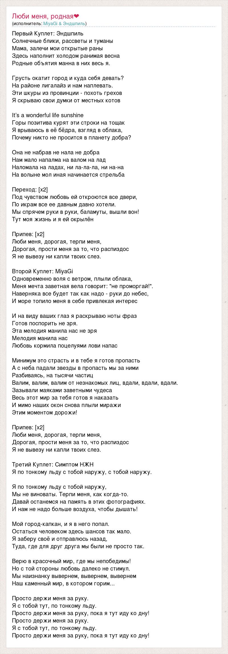 Первый Куплет: Эндшпиль Солнечные блики, рассветы и туманы Мама, залечи мои открытые раны Здесь наполнит холодом ранимая весна Родные объятия манна в них весь я. Грусть окатит город и куда себя девать? На районе лигалайз и нам наплевать. Эти шкуры из провинции - похоть грехов Я скрываю свои думки от местных котов It’s a wonderful life sunshine Горы позитива курят эти строки на тощак Я врываюсь в её бёдра, взгляд в облака, Почему никто не просится в планету добра? Она не набрав не нала не добра Нам мало напалма на валом на лад Наломала на ладах, ни ла-ла-ла, ни на-на На волыне мол иная начинается стрельба Переход: [х2] Под чувством любовь ей откроются все двери, По икрам все ее давным давно хотели. Мы спрячем руки в руки, баламуты, вышли вон! Тут моя жизнь и я ей окрылён Припев: [х2] Люби меня, дорогая, терпи меня, Дорогая, прости меня за то, что распиздос Я не вывезу ни капли твоих слез. Второй Куплет: MiyaGi Одновременно воля с ветром, плыли облака, Меня мечта заветная вела говорит: "не проморгай!". Наверняка все будет так как надо - руки до небес, И море топило меня в себе привлекая интерес И на виду ваших глаз я раскрываю ноты фраз Готов поспорить не зря. Эта мелодия манила нас не зря Мелодия манила нас Любовь кормила поцелуями лови напас Минимум это страсть и в тебе я готов пропасть А с неба падали звезды в пропасть мы за ними Разбиваясь, на тысячи частиц Валим, валим, валим от незнакомых лиц, вдали, вдали, вдали. Зазывали маяками заветными чудеса Весь этот мир за тебя готов я наказать И мимо наших окон снова плыли миражи Этим моментом дорожи! Припев: [х2] Люби меня, дорогая, терпи меня, Дорогая, прости меня за то, что распиздос Я не вывезу ни капли твоих слез. Третий Куплет: Симптом НЖН Я по тонкому льду с тобой наружу, с тобой наружу. Я по тонкому льду с тобой наружу, Мы не виноваты. Терпи меня, как когда-то. Давай останемся на память в этих фотографиях. И нам не надо больше воздуха, чтобы дышать! Мой город-капкан, и я в него попал. Остаться человеком здесь шансов так мало. Я заберу своё и отправлюсь назад, Туда, где для друг друга мы были не просто так. Верю в красочный мир, где мы непобедимы! Но с той стороны любовь далеко не стимул. Мы наизнанку вывернем, вывернем, вывернем Наш каменный мир, в котором горим... Просто держи меня за руку. Я с тобой тут, по тонкому льду. Просто держи меня за руку, пока я тут иду ко дну! Просто держи меня за руку. Я с тобой тут, по тонкому льду. Просто держи меня за руку, пока я тут иду ко дну!