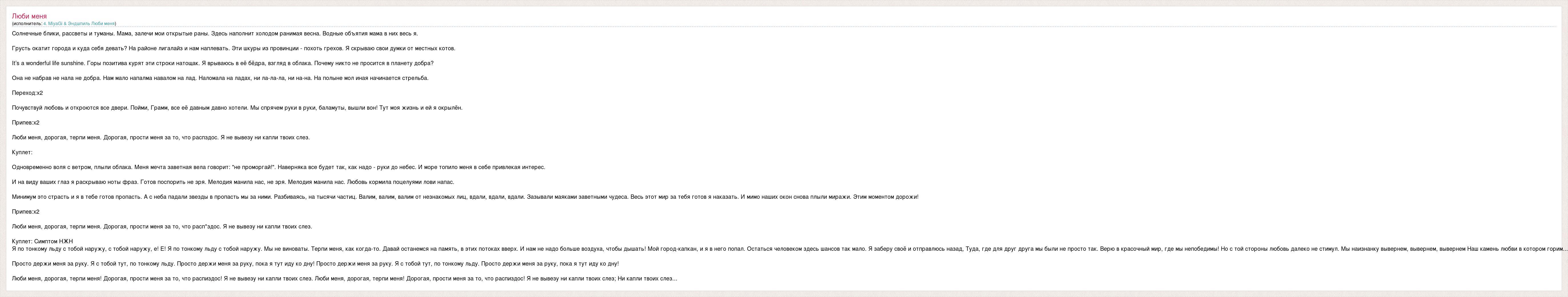 Солнечные блики, рассветы и туманы. Мама, залечи мои открытые раны. Здесь наполнит холодом ранимая весна. Водные объятия мама в них весь я. Грусть окатит города и куда себя девать? На районе лигалайз и нам наплевать. Эти шкуры из провинции - похоть грехов. Я скрываю свои думки от местных котов. It’s a wonderful life sunshine. Горы позитива курят эти строки натощак. Я врываюсь в её бёдра, взгляд в облака. Почему никто не просится в планету добра? Она не набрав не нала не добра. Нам мало напалма навалом на лад. Наломала на ладах, ни ла-ла-ла, ни на-на. На полыне мол иная начинается стрельба. Переход:х2 Почувствуй любовь и откроются все двери. Пойми, Грамм, все её давным давно хотели. Мы спрячем руки в руки, баламуты, вышли вон! Тут моя жизнь и ей я окрылён. Припев:х2 Люби меня, дорогая, терпи меня. Дорогая, прости меня за то, что распздос. Я не вывезу ни капли твоих слез. Куплет: Одновременно воля с ветром, плыли облака. Меня мечта заветная вела говорит: "не проморгай!". Наверняка все будет так, как надо - руки до небес. И море топило меня в себе привлекая интерес. И на виду ваших глаз я раскрываю ноты фраз. Готов поспорить не зря. Мелодия манила нас, не зря. Мелодия манила нас. Любовь кормила поцелуями лови напас. Минимум это страсть и я в тебе готов пропасть. А с неба падали звезды в пропасть мы за ними. Разбиваясь, на тысячи частиц. Валим, валим, валим от незнакомых лиц, вдали, вдали, вдали. Зазывали маяками заветными чудеса. Весь этот мир за тебя готов я наказать. И мимо наших окон снова плыли миражи. Этим моментом дорожи! Припев:х2 Люби меня, дорогая, терпи меня. Дорогая, прости меня за то, что расп*здос. Я не вывезу ни капли твоих слез. Куплет: Симптом НЖН Я по тонкому льду с тобой наружу, с тобой наружу, е! Е! Я по тонкому льду с тобой наружу. Мы не виноваты. Терпи меня, как когда-то. Давай останемся на память, в этих потоках вверх. И нам не надо больше воздуха, чтобы дышать! Мой город-капкан, и я в него попал. Остаться человеком здесь шансов так мало. Я заберу своё и отправлюсь назад, Туда, где для друг друга мы были не просто так. Верю в красочный мир, где мы непобедимы! Но с той стороны любовь далеко не стимул. Мы наизнанку вывернем, вывернем, вывернем Наш камень любви в котором горим... Просто держи меня за руку. Я с тобой тут, по тонкому льду. Просто держи меня за руку, пока я тут иду ко дну! Просто держи меня за руку. Я с тобой тут, по тонкому льду. Просто держи меня за руку, пока я тут иду ко дну! Люби меня, дорогая, терпи меня! Дорогая, прости меня за то, что распиздос! Я не вывезу ни капли твоих слез. Люби меня, дорогая, терпи меня! Дорогая, прости меня за то, что распиздос! Я не вывезу ни капли твоих слез; Ни капли твоих слез...