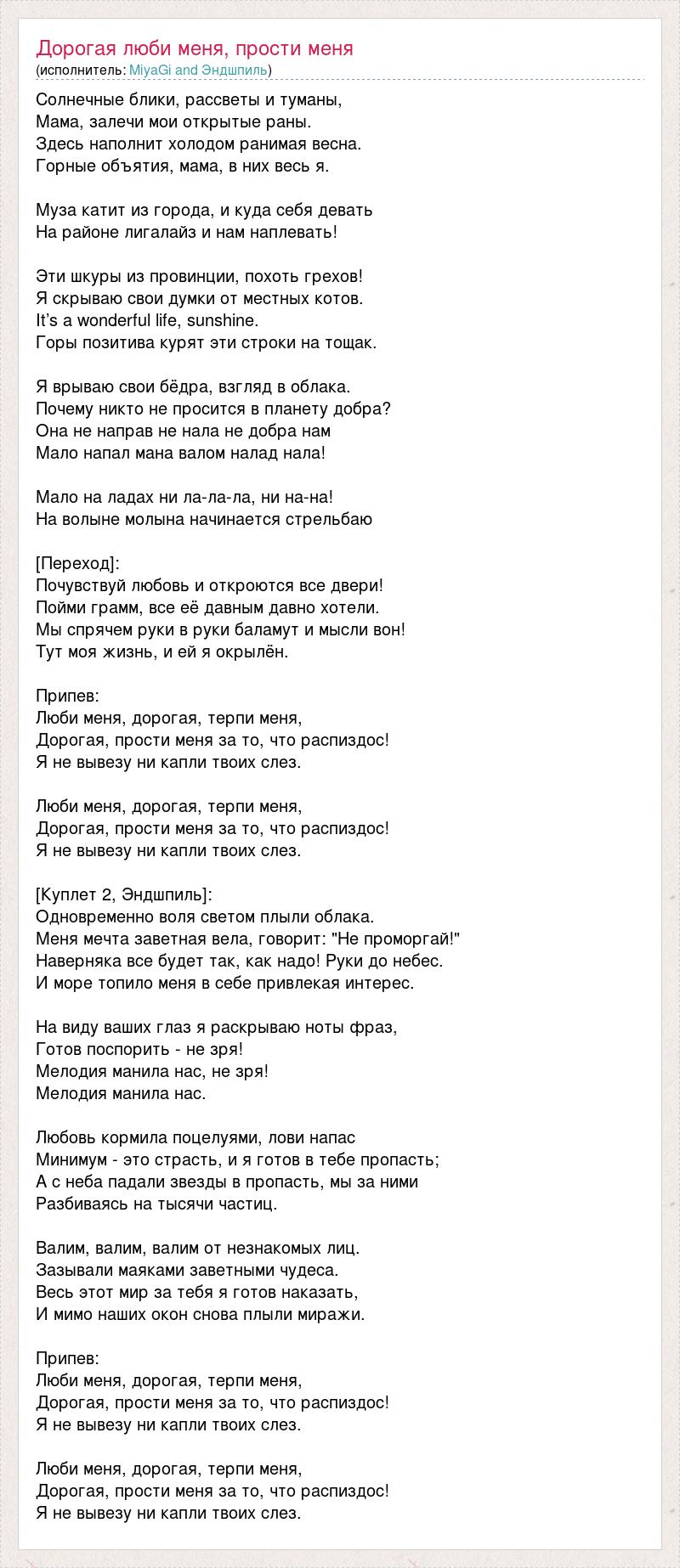 Солнечные блики, рассветы и туманы, Мама, залечи мои открытые раны. Здесь наполнит холодом ранимая весна. Горные объятия, мама, в них весь я. Муза катит из города, и куда себя девать На районе лигалайз и нам наплевать! Эти шкуры из провинции, похоть грехов! Я скрываю свои думки от местных котов. It’s a wonderful life, sunshine. Горы позитива курят эти строки на тощак. Я врываю свои бёдра, взгляд в облака. Почему никто не просится в планету добра? Она не направ не нала не добра нам Мало напал мана валом налад нала! Мало на ладах ни ла-ла-ла, ни на-на! На волыне молына начинается стрельбаю [Переход]: Почувствуй любовь и откроются все двери! Пойми грамм, все её давным давно хотели. Мы спрячем руки в руки баламут и мысли вон! Тут моя жизнь, и ей я окрылён. Припев: Люби меня, дорогая, терпи меня, Дорогая, прости меня за то, что распиздос! Я не вывезу ни капли твоих слез. Люби меня, дорогая, терпи меня, Дорогая, прости меня за то, что распиздос! Я не вывезу ни капли твоих слез. [Куплет 2, Эндшпиль]: Одновременно воля светом плыли облака. Меня мечта заветная вела, говорит: "Не проморгай!" Наверняка все будет так, как надо! Руки до небес. И море топило меня в себе привлекая интерес. На виду ваших глаз я раскрываю ноты фраз, Готов поспорить - не зря! Мелодия манила нас, не зря! Мелодия манила нас. Любовь кормила поцелуями, лови напас Минимум - это страсть, и я готов в тебе пропасть; А с неба падали звезды в пропасть, мы за ними Разбиваясь на тысячи частиц. Валим, валим, валим от незнакомых лиц. Зазывали маяками заветными чудеса. Весь этот мир за тебя я готов наказать, И мимо наших окон снова плыли миражи. Припев: Люби меня, дорогая, терпи меня, Дорогая, прости меня за то, что распиздос! Я не вывезу ни капли твоих слез. Люби меня, дорогая, терпи меня, Дорогая, прости меня за то, что распиздос! Я не вывезу ни капли твоих слез.