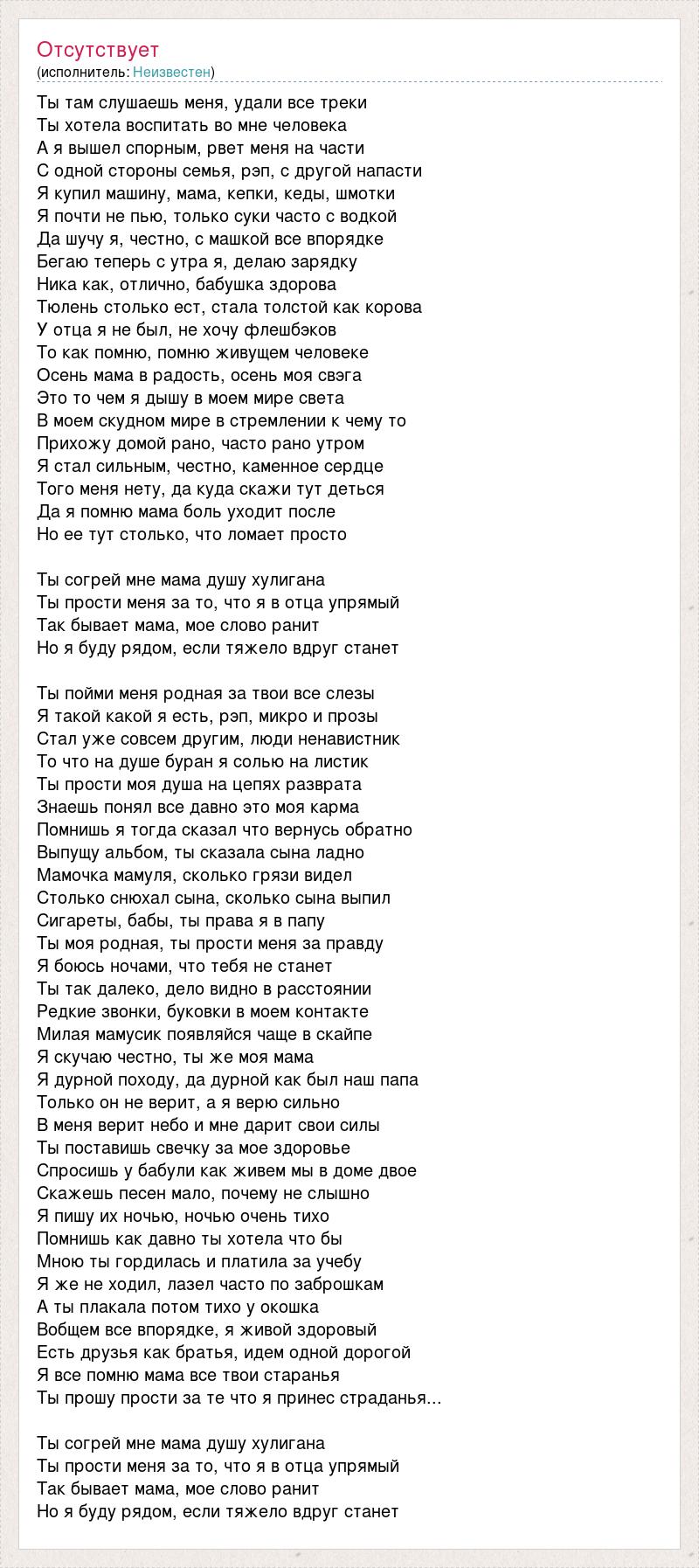 Ты там слушаешь меня, удали все треки Ты хотела воспитать во мне человека А я вышел спорным, рвет меня на части С одной стороны семья, рэп, с другой напасти Я купил машину, мама, кепки, кеды, шмотки Я почти не пью, только суки часто с водкой Да шучу я, честно, с машкой все впорядке Бегаю теперь с утра я, делаю зарядку Ника как, отлично, бабушка здорова Тюлень столько ест, стала толстой как корова У отца я не был, не хочу флешбэков То как помню, помню живущем человеке Осень мама в радость, осень моя свэга Это то чем я дышу в моем мире света В моем скудном мире в стремлении к чему то Прихожу домой рано, часто рано утром Я стал сильным, честно, каменное сердце Того меня нету, да куда скажи тут деться Да я помню мама боль уходит после Но ее тут столько, что ломает просто Ты согрей мне мама душу хулигана Ты прости меня за то, что я в отца упрямый Так бывает мама, мое слово ранит Но я буду рядом, если тяжело вдруг станет Ты пойми меня родная за твои все слезы Я такой какой я есть, рэп, микро и прозы Стал уже совсем другим, люди ненавистник То что на душе буран я солью на листик Ты прости моя душа на цепях разврата Знаешь понял все давно это моя карма Помнишь я тогда сказал что вернусь обратно Выпущу альбом, ты сказала сына ладно Мамочка мамуля, сколько грязи видел Столько снюхал сына, сколько сына выпил Сигареты, бабы, ты права я в папу Ты моя родная, ты прости меня за правду Я боюсь ночами, что тебя не станет Ты так далеко, дело видно в расстоянии Редкие звонки, буковки в моем контакте Милая мамусик появляйся чаще в скайпе Я скучаю честно, ты же моя мама Я дурной походу, да дурной как был наш папа Только он не верит, а я верю сильно В меня верит небо и мне дарит свои силы Ты поставишь свечку за мое здоровье Спросишь у бабули как живем мы в доме двое Скажешь песен мало, почему не слышно Я пишу их ночью, ночью очень тихо Помнишь как давно ты хотела что бы Мною ты гордилась и платила за учебу Я же не ходил, лазел часто по заброшкам А ты плакала потом тихо у окошка Вобщем все впорядке, я живой здоровый Есть друзья как братья, идем одной дорогой Я все помню мама все твои старанья Ты прошу прости за те что я принес страданья... Ты согрей мне мама душу хулигана Ты прости меня за то, что я в отца упрямый Так бывает мама, мое слово ранит Но я буду рядом, если тяжело вдруг станет