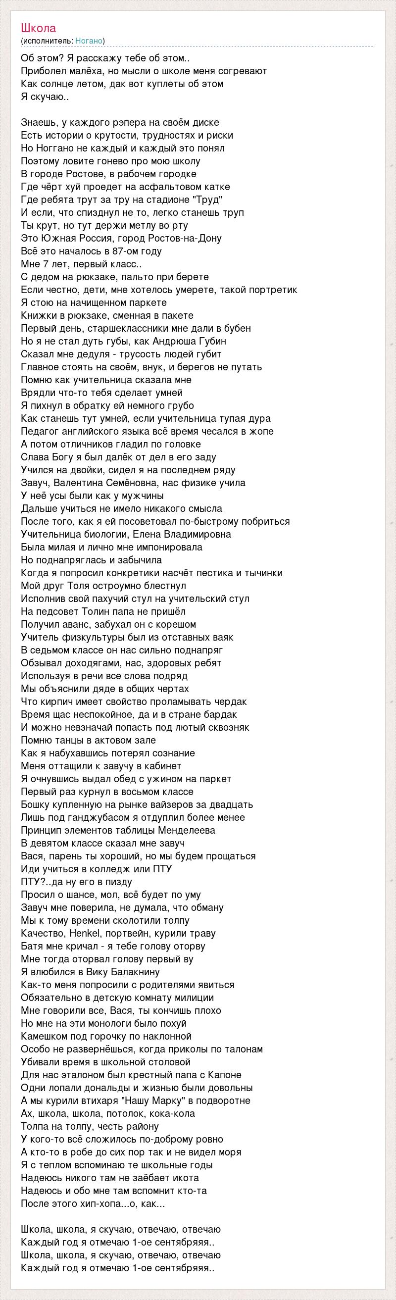 Об этом? Я расскажу тебе об этом.. Приболел малёха, но мысли о школе меня согревают Как солнце летом, дак вот куплеты об этом Я скучаю.. Знаешь, у каждого рэпера на своём диске Есть истории о крутости, трудностях и риски Но Ноггано не каждый и каждый это понял Поэтому ловите гонево про мою школу В городе Ростове, в рабочем городке Где чёрт хуй проедет на асфальтовом катке Где ребята трут за тру на стадионе "Труд" И если, что спизднул не то, легко станешь труп Ты крут, но тут держи метлу во рту Это Южная Россия, город Ростов-на-Дону Всё это началось в 87-ом году Мне 7 лет, первый класс.. С дедом на рюкзаке, пальто при берете Если честно, дети, мне хотелось умерете, такой портретик Я стою на начищенном паркете Книжки в рюкзаке, сменная в пакете Первый день, старшеклассники мне дали в бубен Но я не стал дуть губы, как Андрюша Губин Сказал мне дедуля - трусость людей губит Главное стоять на своём, внук, и берегов не путать Помню как учительница сказала мне Врядли что-то тебя сделает умней Я пихнул в обратку ей немного грубо Как станешь тут умней, если учительница тупая дура Педагог английского языка всё время чесался в жопе А потом отличников гладил по головке Слава Богу я был далёк от дел в его заду Учился на двойки, сидел я на последнем ряду Завуч, Валентина Семёновна, нас физике учила У неё усы были как у мужчины Дальше учиться не имело никакого смысла После того, как я ей посоветовал по-быстрому побриться Учительница биологии, Елена Владимировна Была милая и лично мне импонировала Но поднапряглась и забычила Когда я попросил конкретики насчёт пестика и тычинки Мой друг Толя остроумно блестнул Исполнив свой пахучий стул на учительский стул На педсовет Толин папа не пришёл Получил аванс, забухал он с корешом Учитель физкультуры был из отставных ваяк В седьмом классе он нас сильно поднапряг Обзывал доходягами, нас, здоровых ребят Используя в речи все слова подряд Мы объяснили дяде в общих чертах Что кирпич имеет свойство проламывать чердак Время щас неспокойное, да и в стране бардак И можно невзначай попасть под лютый сквозняк Помню танцы в актовом зале Как я набухавшись потерял сознание Меня оттащили к завучу в кабинет Я очнувшись выдал обед с ужином на паркет Первый раз курнул в восьмом классе Бошку купленную на рынке вайзеров за двадцать Лишь под ганджубасом я отдуплил более менее Принцип элементов таблицы Менделеева В девятом классе сказал мне завуч Вася, парень ты хороший, но мы будем прощаться Иди учиться в колледж или ПТУ ПТУ?..да ну его в пизду Просил о шансе, мол, всё будет по уму Завуч мне поверила, не думала, что обману Мы к тому времени сколотили толпу Качество, Henkel, портвейн, курили траву Батя мне кричал - я тебе голову оторву Мне тогда оторвал голову первый ву Я влюбился в Вику Балакнину Как-то меня попросили с родителями явиться Обязательно в детскую комнату милиции Мне говорили все, Вася, ты кончишь плохо Но мне на эти монологи было похуй Камешком под горочку по наклонной Особо не развернёшься, когда приколы по талонам Убивали время в школьной столовой Для нас эталоном был крестный папа с Капоне Одни лопали дональды и жизнью были довольны А мы курили втихаря "Нашу Марку" в подворотне Ах, школа, школа, потолок, кока-кола Толпа на толпу, честь району У кого-то всё сложилось по-доброму ровно А кто-то в робе до сих пор так и не видел моря Я с тепло