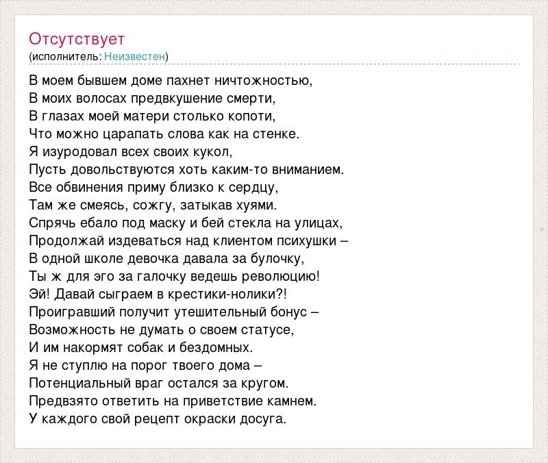 В моем бывшем доме пахнет ничтожностью, В моих волосах предвкушение смерти, В глазах моей матери столько копоти, Что можно царапать слова как на стенке. Я изуродовал всех своих кукол, Пусть довольствуются хоть каким-то вниманием. Все обвинения приму близко к сердцу, Там же смеясь, сожгу, затыкав хуями. Спрячь ебало под маску и бей стекла на улицах, Продолжай издеваться над клиентом психушки – В одной школе девочка давала за булочку, Ты ж для эго за галочку ведешь революцию! Эй! Давай сыграем в крестики-нолики?! Проигравший получит утешительный бонус – Возможность не думать о своем статусе, И им накормят собак и бездомных. Я не ступлю на порог твоего дома – Потенциальный враг остался за кругом. Предвзято ответить на приветствие камнем. У каждого свой рецепт окраски досуга.