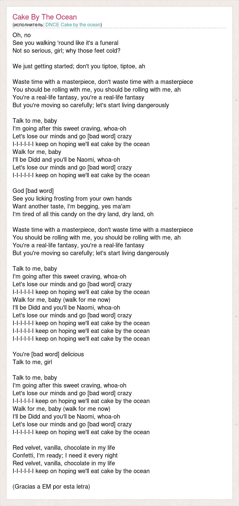 Oh, no See you walking 'round like it's a funeral Not so serious, girl; why those feet cold? We just getting started; don't you tiptoe, tiptoe, ah Waste time with a masterpiece, don't waste time with a masterpiece You should be rolling with me, you should be rolling with me, ah You're a real-life fantasy, you're a real-life fantasy But you're moving so carefully; let's start living dangerously Talk to me, baby I'm going after this sweet craving, whoa-oh Let's lose our minds and go [bad word] crazy I-I-I-I-I-I keep on hoping we'll eat cake by the ocean Walk for me, baby I'll be Didd and you'll be Naomi, whoa-oh Let's lose our minds and go [bad word] crazy I-I-I-I-I-I keep on hoping we'll eat cake by the ocean God [bad word] See you licking frosting from your own hands Want another taste, I'm begging, yes ma'am I'm tired of all this candy on the dry land, dry land, oh Waste time with a masterpiece, don't waste time with a masterpiece You should be rolling with me, you should be rolling with me, ah You're a real-life fantasy, you're a real-life fantasy But you're moving so carefully; let's start living dangerously Talk to me, baby I'm going after this sweet craving, whoa-oh Let's lose our minds and go [bad word] crazy I-I-I-I-I-I keep on hoping we'll eat cake by the ocean Walk for me, baby (walk for me now) I'll be Didd and you'll be Naomi, whoa-oh Let's lose our minds and go [bad word] crazy I-I-I-I-I-I keep on hoping we'll eat cake by the ocean I-I-I-I-I-I keep on hoping we'll eat cake by the ocean I-I-I-I-I-I keep on hoping we'll eat cake by the ocean You're [bad word] delicious Talk to me, girl Talk to me, baby I'm going after this sweet craving, whoa-oh Let's lose our minds and go [bad word] crazy I-I-I-I-I-I keep on hoping we'll eat cake by the ocean Walk for me, baby (walk for me now) I'll be Didd and you'll be Naomi, whoa-oh Let's lose our minds and go [bad word] crazy I-I-I-I-I-I keep on hoping we'll eat cake by the ocean Red velvet, vanilla, chocolate in my life Confetti, I'm ready; I need it every night Red velvet, vanilla, chocolate in my life I-I-I-I-I-I keep on hoping we'll eat cake by the ocean (Gracias a EM por esta letra)