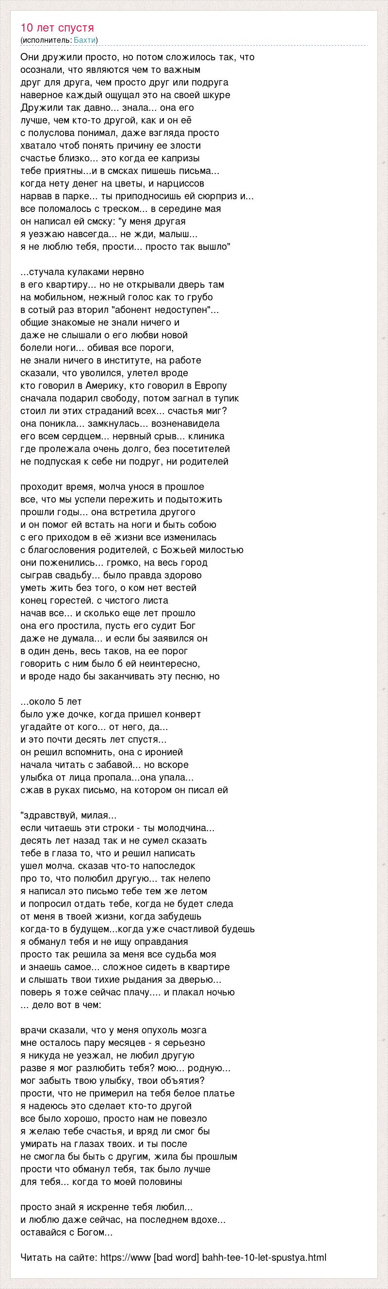 Они дружили просто, но потом сложилось так, что осознали, что являются чем то важным друг для друга, чем просто друг или подруга наверное каждый ощущал это на своей шкуре Дружили так давно... знала... она его лучше, чем кто-то другой, как и он её с полуслова понимал, даже взгляда просто хватало чтоб понять причину ее злости счастье близко... это когда ее капризы тебе приятны...и в смсках пишешь письма... когда нету денег на цветы, и нарциссов нарвав в парке... ты приподносишь ей сюрприз и... все поломалось с треском... в середине мая он написал ей смску: "у меня другая я уезжаю навсегда... не жди, малыш... я не люблю тебя, прости... просто так вышло" ...стучала кулаками нервно в его квартиру... но не открывали дверь там на мобильном, нежный голос как то грубо в сотый раз вторил "абонент недоступен"... общие знакомые не знали ничего и даже не слышали о его любви новой болели ноги... обивая все пороги, не знали ничего в институте, на работе сказали, что уволился, улетел вроде кто говорил в Америку, кто говорил в Европу сначала подарил свободу, потом загнал в тупик стоил ли этих страданий всех... счастья миг? она поникла... замкнулась... возненавидела его всем сердцем... нервный срыв... клиника где пролежала очень долго, без посетителей не подпуская к себе ни подруг, ни родителей проходит время, молча унося в прошлое все, что мы успели пережить и подытожить прошли годы... она встретила другого и он помог ей встать на ноги и быть собою с его приходом в её жизни все изменилась с благословения родителей, с Божьей милостью они поженились... громко, на весь город сыграв свадьбу... было правда здорово уметь жить без того, о ком нет вестей конец горестей. с чистого листа начав все... и сколько еще лет прошло она его простила, пусть его судит Бог даже не думала... и если бы заявился он в один день, весь таков, на ее порог говорить с ним было б ей неинтересно, и вроде надо бы заканчивать эту песню, но ...около 5 лет было уже дочке, когда пришел конверт угадайте от кого... от него, да... и это почти десять лет спустя... он решил вспомнить, она с иронией начала читать с забавой... но вскоре улыбка от лица пропала...она упала... сжав в руках письмо, на котором он писал ей "здравствуй, милая... если читаешь эти строки - ты молодчина... десять лет назад так и не сумел сказать тебе в глаза то, что и решил написать ушел молча. сказав что-то напоследок про то, что полюбил другую... так нелепо я написал это письмо тебе тем же летом и попросил отдать тебе, когда не будет следа от меня в твоей жизни, когда забудешь когда-то в будущем...когда уже счастливой будешь я обманул тебя и не ищу оправдания просто так решила за меня все судьба моя и знаешь самое... сложное сидеть в квартире и слышать твои тихие рыдания за дверью... поверь я тоже сейчас плачу.... и плакал ночью ... дело вот в чем: врачи сказали, что у меня опухоль мозга мне осталось пару месяцев - я серьезно я никуда не уезжал, не любил другую разве я мог разлюбить тебя? мою... родную... мог забыть твою улыбку, твои объятия? прости, что не примерил на тебя белое платье я надеюсь это сделает кто-то другой все было хорошо, просто нам не повезло я желаю тебе счастья, и вряд ли смог бы умирать на глазах твоих. и ты после не смогла бы быть с другим, жила бы прошлым прости что обманул тебя, так было лучше для тебя... когда то моей половины просто знай я искренне тебя любил... и люблю даже сейчас, на п