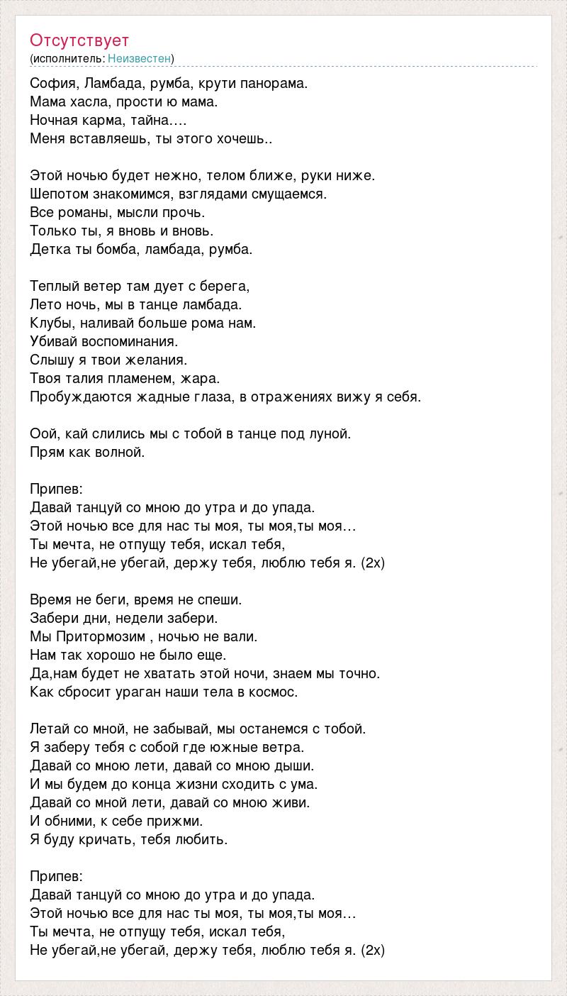 София, Ламбада, румба, крути панорама. Мама хасла, прости ю мама. Ночная карма, тайна…. Меня вставляешь, ты этого хочешь.. Этой ночью будет нежно, телом ближе, руки ниже. Шепотом знакомимся, взглядами смущаемся. Все романы, мысли прочь. Только ты, я вновь и вновь. Детка ты бомба, ламбада, румба. Теплый ветер там дует с берега, Лето ночь, мы в танце ламбада. Клубы, наливай больше рома нам. Убивай воспоминания. Слышу я твои желания. Твоя талия пламенем, жара. Пробуждаются жадные глаза, в отражениях вижу я себя. Оой, кай слились мы с тобой в танце под луной. Прям как волной. Припев: Давай танцуй со мною до утра и до упада. Этой ночью все для нас ты моя, ты моя,ты моя… Ты мечта, не отпущу тебя, искал тебя, Не убегай,не убегай, держу тебя, люблю тебя я. (2х) Время не беги, время не спеши. Забери дни, недели забери. Мы Притормозим , ночью не вали. Нам так хорошо не было еще. Да,нам будет не хватать этой ночи, знаем мы точно. Как сбросит ураган наши тела в космос. Летай со мной, не забывай, мы останемся с тобой. Я заберу тебя с собой где южные ветра. Давай со мною лети, давай со мною дыши. И мы будем до конца жизни сходить с ума. Давай со мной лети, давай со мною живи. И обними, к себе прижми. Я буду кричать, тебя любить. Припев: Давай танцуй со мною до утра и до упада. Этой ночью все для нас ты моя, ты моя,ты моя… Ты мечта, не отпущу тебя, искал тебя, Не убегай,не убегай, держу тебя, люблю тебя я. (2х)