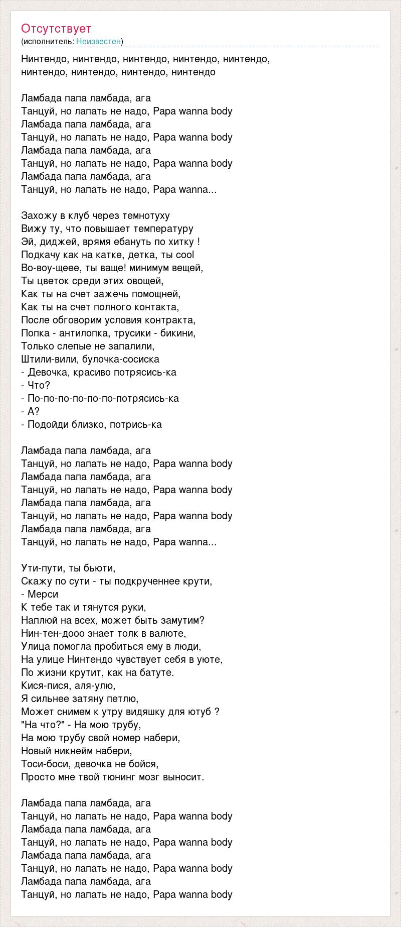 Нинтендо, нинтендо, нинтендо, нинтендо, нинтендо, нинтендо, нинтендо, нинтендо, нинтендо Ламбада папа ламбада, ага Танцуй, но лапать не надо, Papa wanna body Ламбада папа ламбада, ага Танцуй, но лапать не надо, Papa wanna body Ламбада папа ламбада, ага Танцуй, но лапать не надо, Papa wanna body Ламбада папа ламбада, ага Танцуй, но лапать не надо, Papa wanna... Захожу в клуб через темнотуху Вижу ту, что повышает температуру Эй, диджей, врямя ебануть по хитку ! Подкачу как на катке, детка, ты cool Во-воу-щеее, ты ваще! минимум вещей, Ты цветок среди этих овощей, Как ты на счет зажечь помощней, Как ты на счет полного контакта, После обговорим условия контракта, Попка - антилопка, трусики - бикини, Только слепые не запалили, Штили-вили, булочка-сосиска - Девочка, красиво потрясись-ка - Что? - По-по-по-по-по-по-потрясись-ка - А? - Подойди близко, потрись-ка Ламбада папа ламбада, ага Танцуй, но лапать не надо, Papa wanna body Ламбада папа ламбада, ага Танцуй, но лапать не надо, Papa wanna body Ламбада папа ламбада, ага Танцуй, но лапать не надо, Papa wanna body Ламбада папа ламбада, ага Танцуй, но лапать не надо, Papa wanna... Ути-пути, ты бьюти, Скажу по сути - ты подкрученнее крути, - Мерси К тебе так и тянутся руки, Наплюй на всех, может быть замутим? Нин-тен-дооо знает толк в валюте, Улица помогла пробиться ему в люди, На улице Нинтендо чувствует себя в уюте, По жизни крутит, как на батуте. Кися-пися, аля-улю, Я сильнее затяну петлю, Может снимем к утру видяшку для ютуб ? "На что?" - На мою трубу, На мою трубу свой номер набери, Новый никнейм набери, Тоси-боси, девочка не бойся, Просто мне твой тюнинг мозг выносит. Ламбада папа ламбада, ага Танцуй, но лапать не надо, Papa wanna body Ламбада папа ламбада, ага Танцуй, но лапать не надо, Papa wanna body Ламбада папа ламбада, ага Танцуй, но лапать не надо, Papa wanna body Ламбада папа ламбада, ага Танцуй, но лапать не надо, Papa wanna body